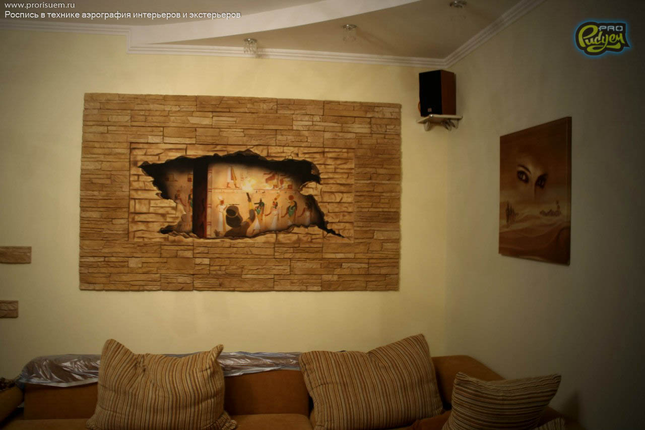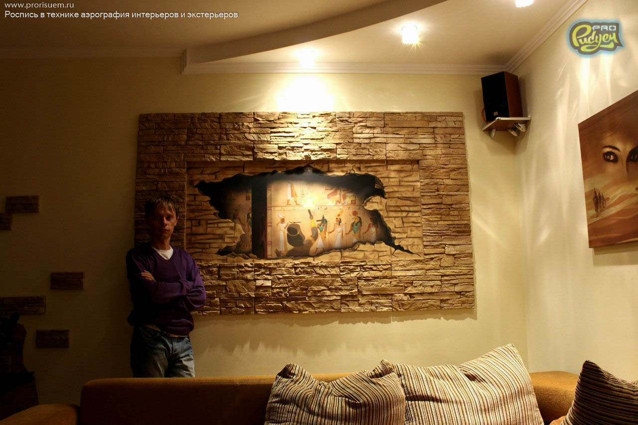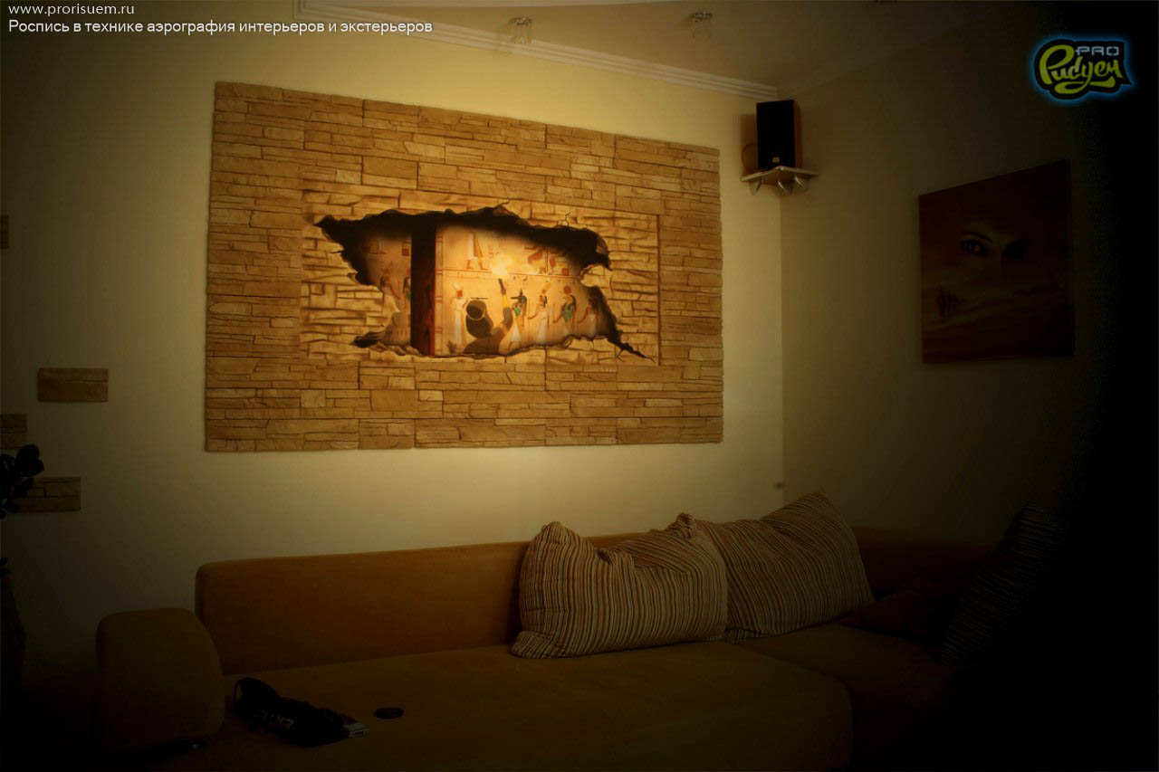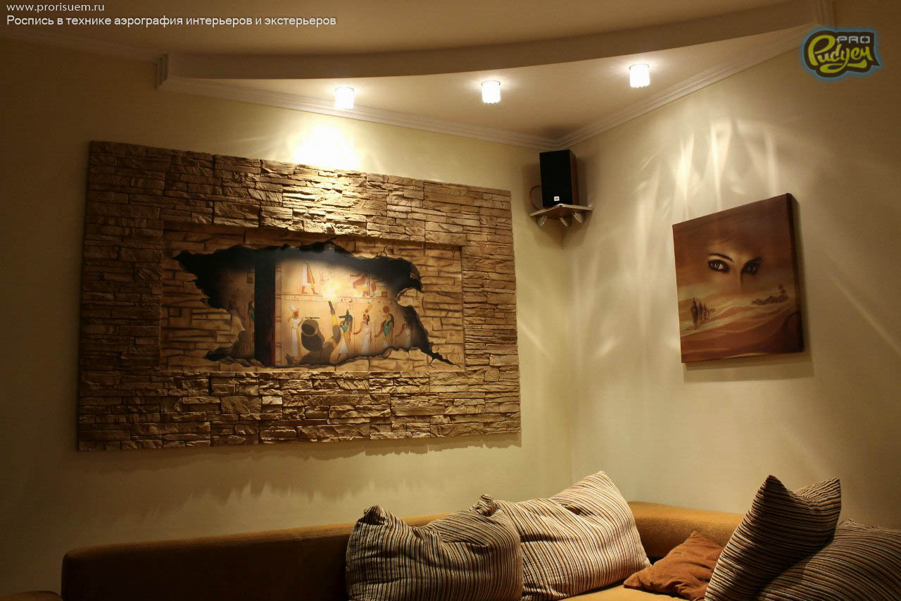 Нам, как в прочем и всегда, предстояла трудная задача выполнить рисунок в технике «аэрография», учитывая желания заказчика так, чтобы роспись подходила под дизайн комнаты. И мы не ударили в грязь лицом. Получилась отличная сокровищница Египта.