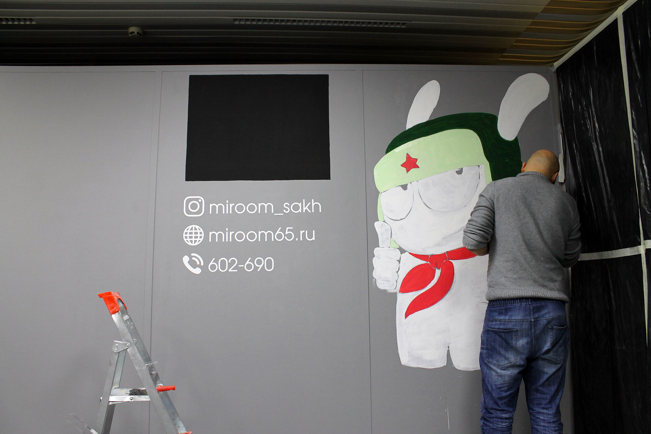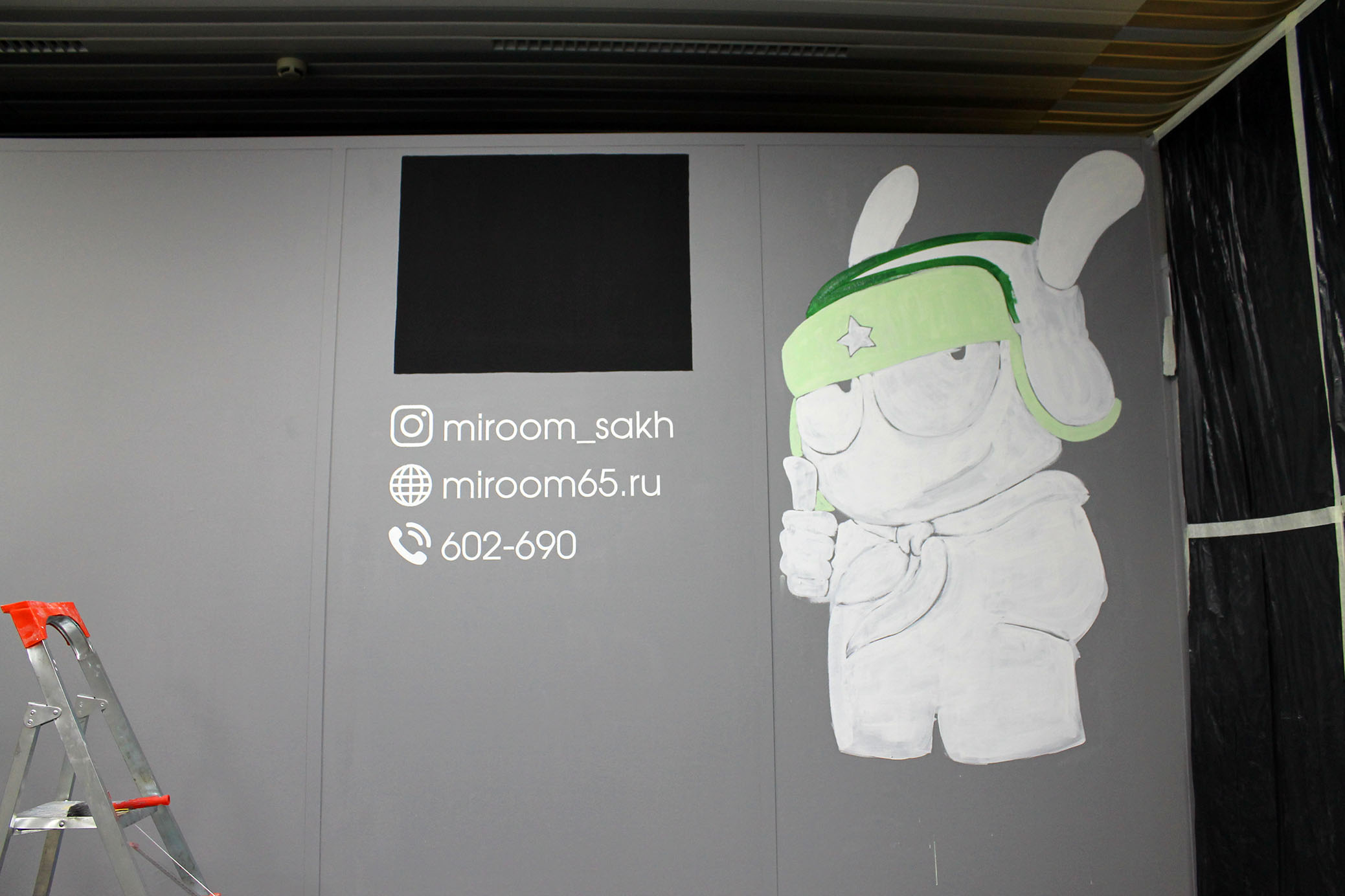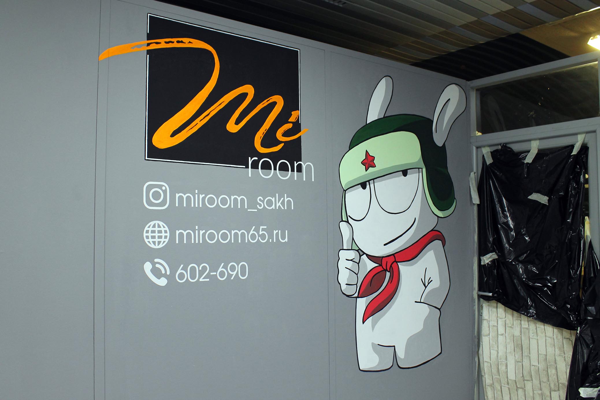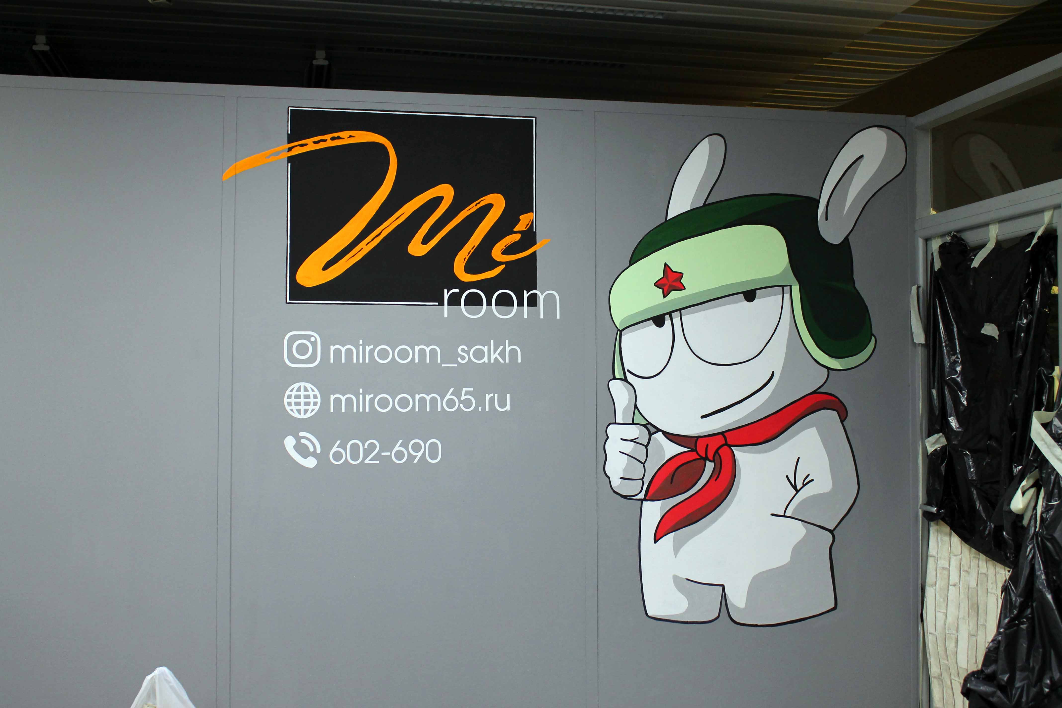 оформили стену логотипом и персонажем компании Xiaomi. Получилось ярко и красочно!
