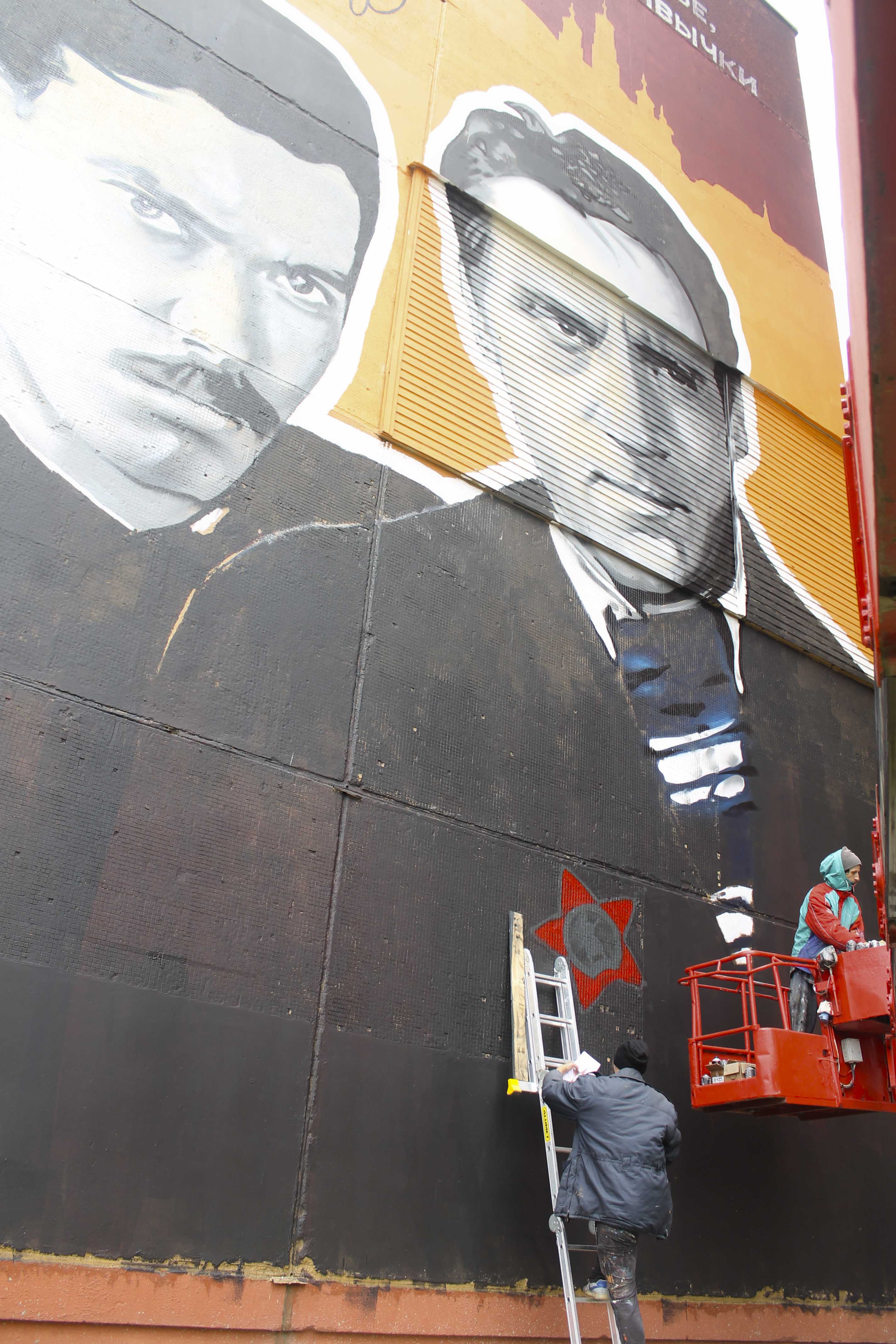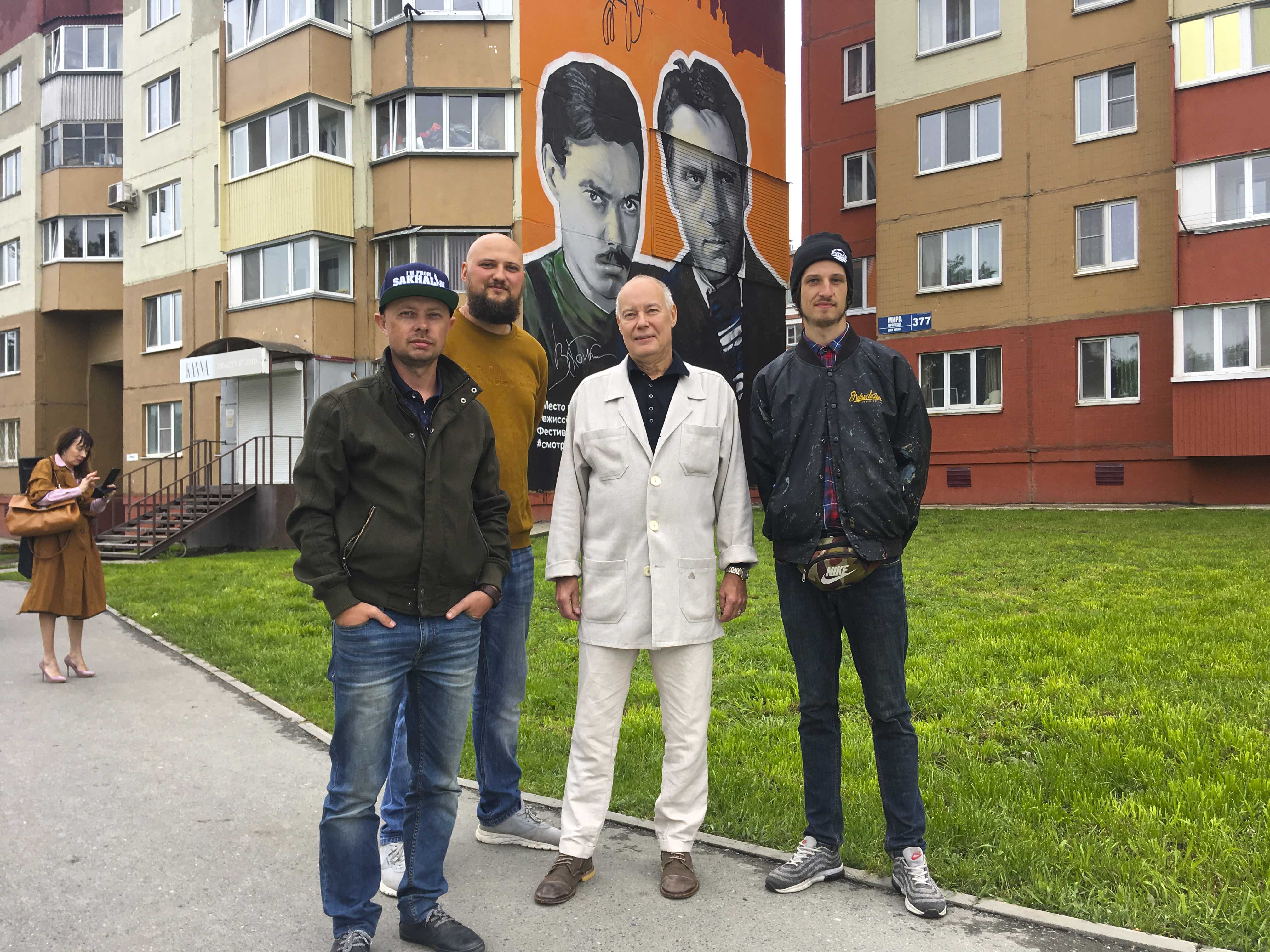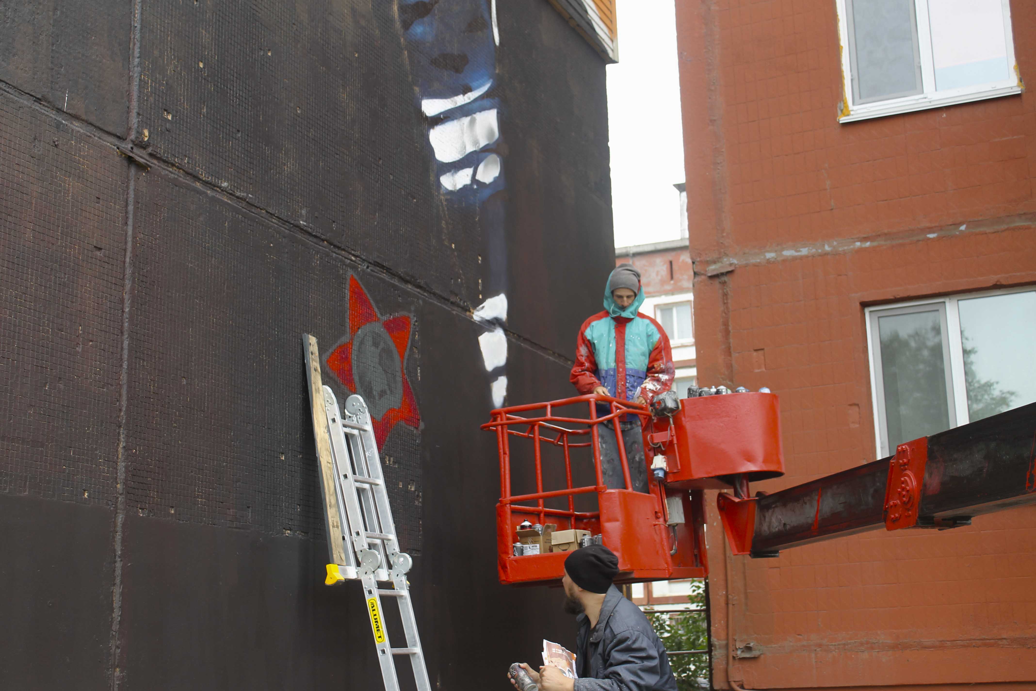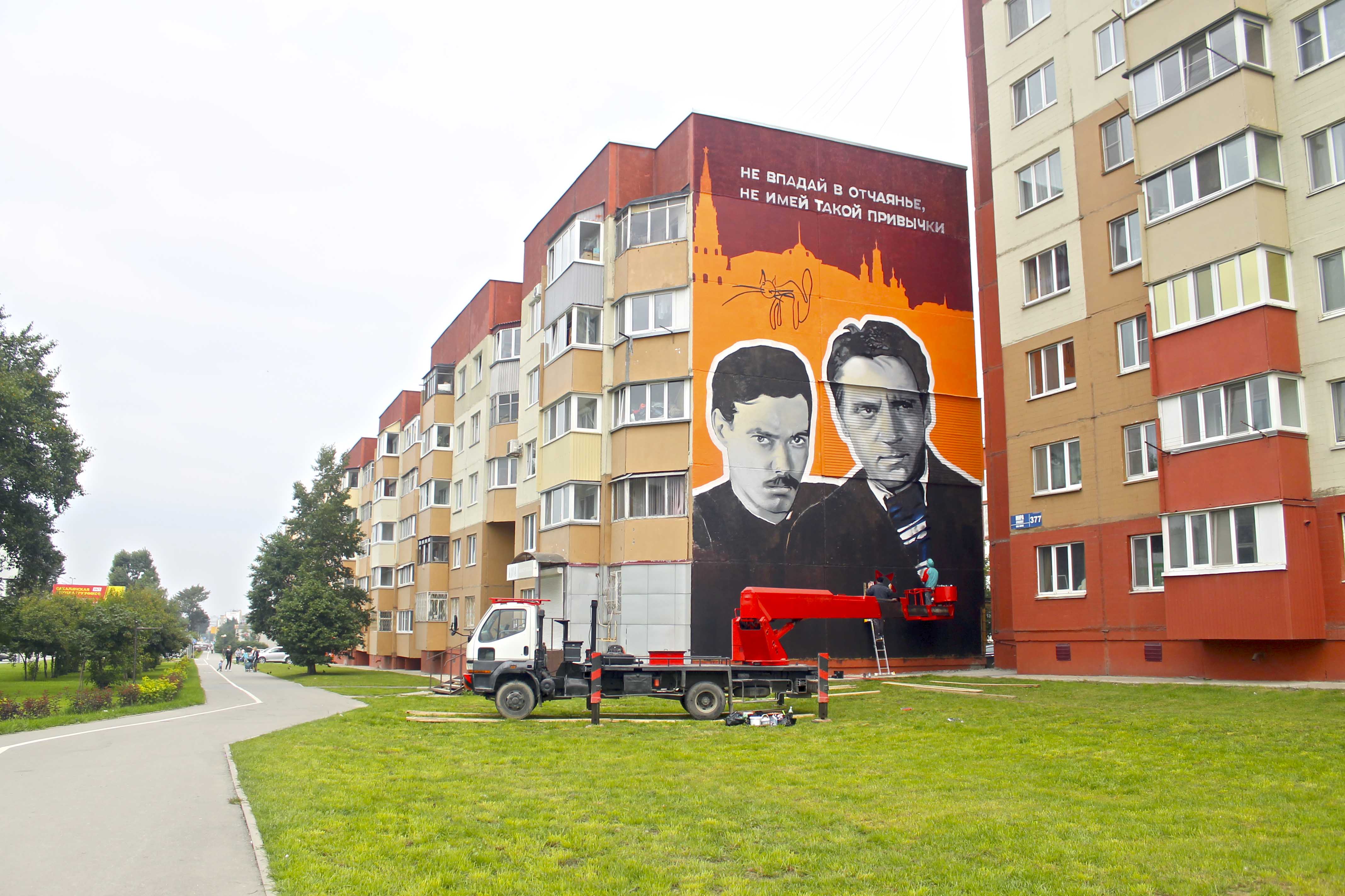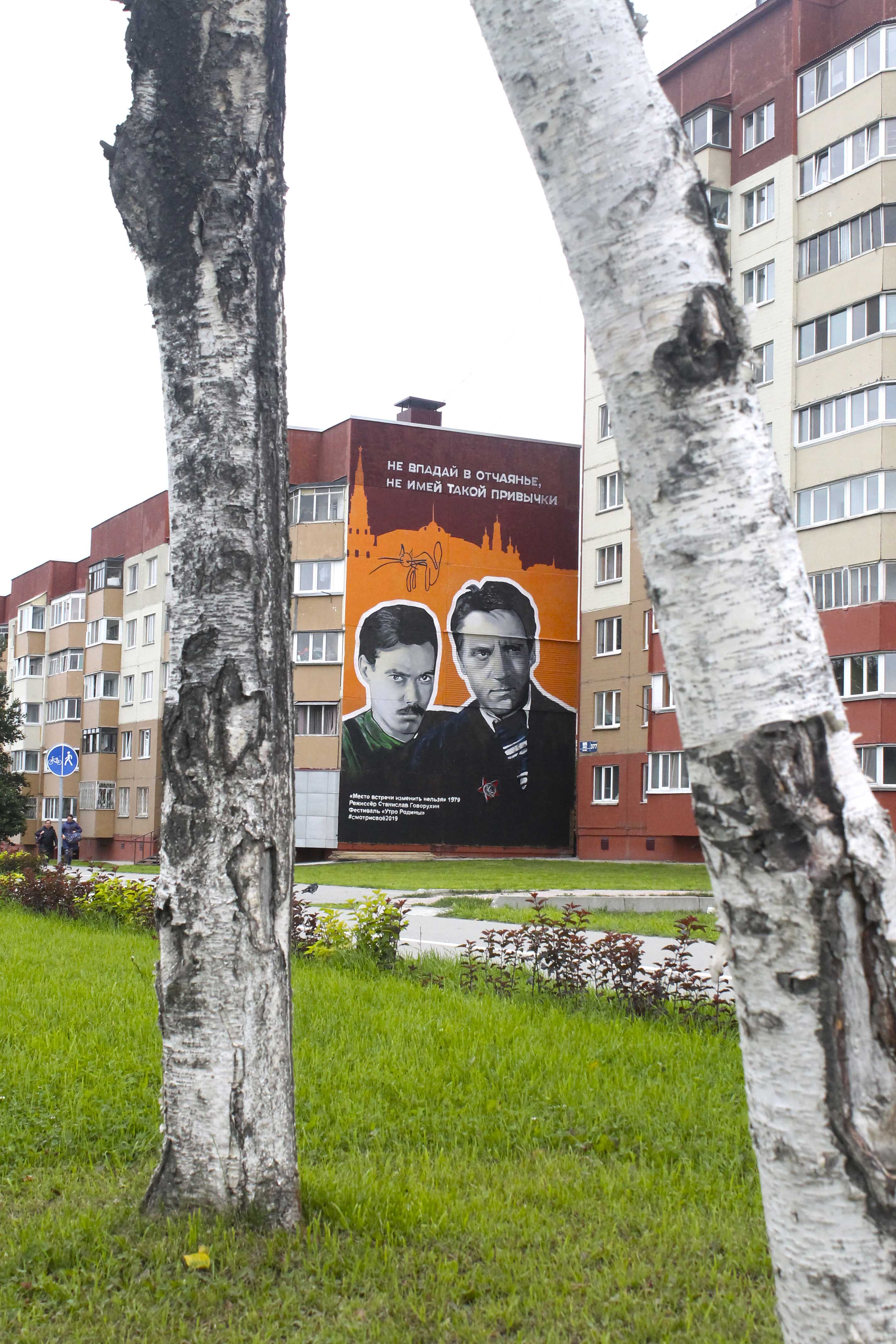 За лето 2019г. мы выполнили второй паблик-арт в нашем городе. Над фасадом работало три художника, Евгений Тарасенко, Валерий Савин, Гера Алкидный это была коллаборация художников, работающих в разных стилях. На открытие фасада прилетал Владимир Конкин он же Володя Шарапов игравший роль в фильме «Место встречи изменить нельзя», он был очень счастлив что нам удалось передать детали актеров, и картина получилась очень удачно.