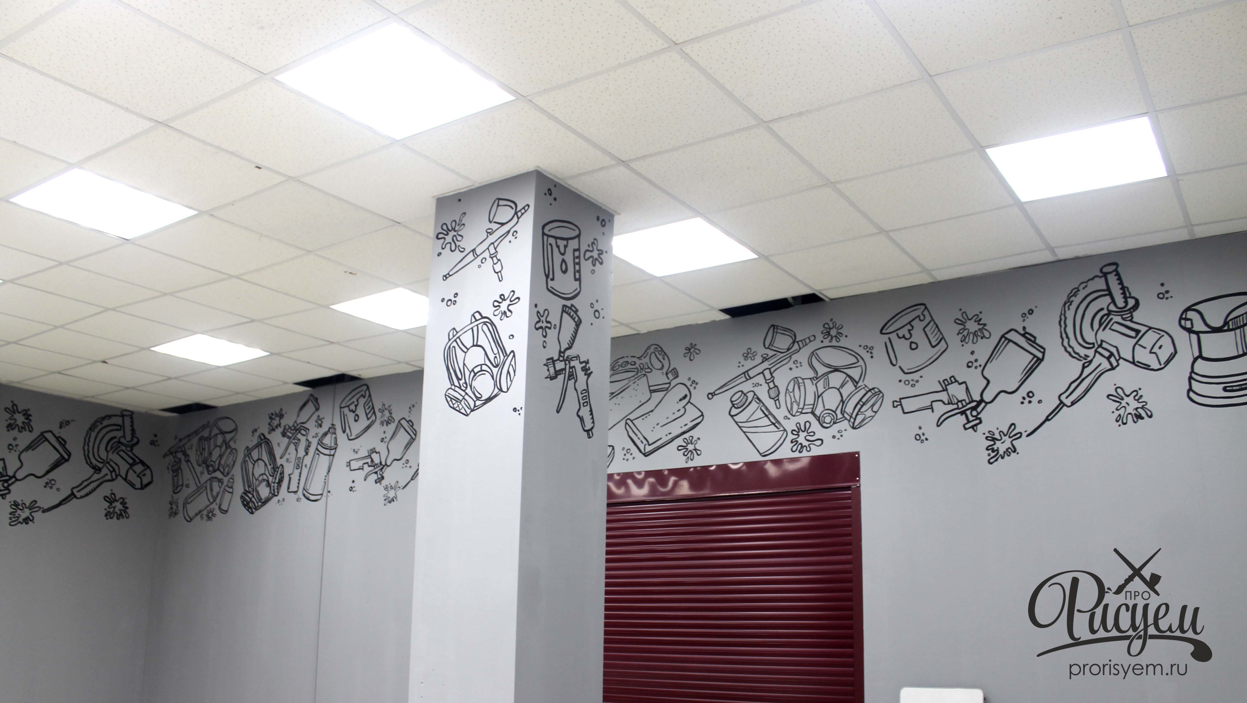 был выбран такой подход - все нанесенные на стены изображения погружают в атмосферу связанную с творчеством и кузовным ремонтом авто.