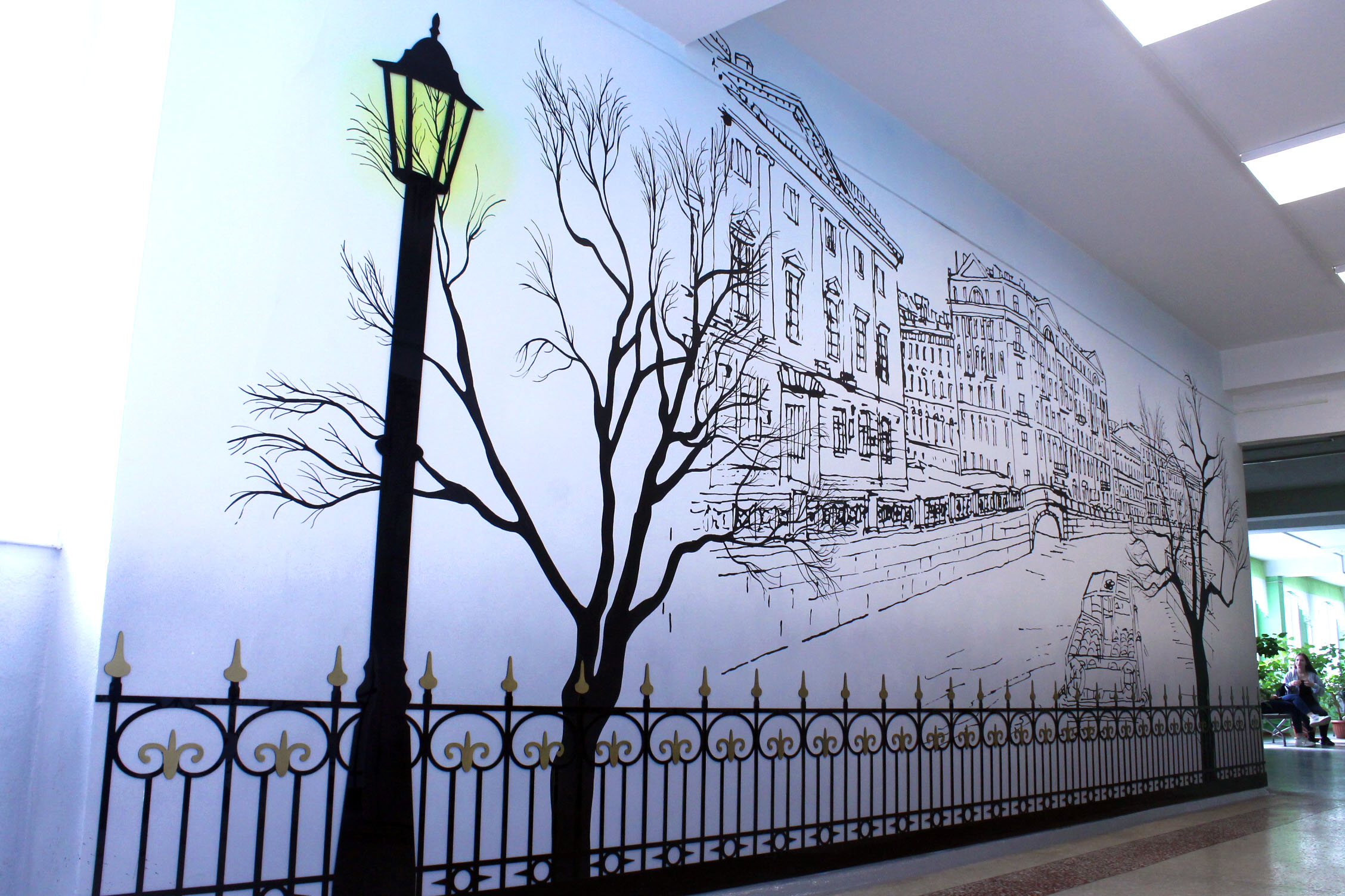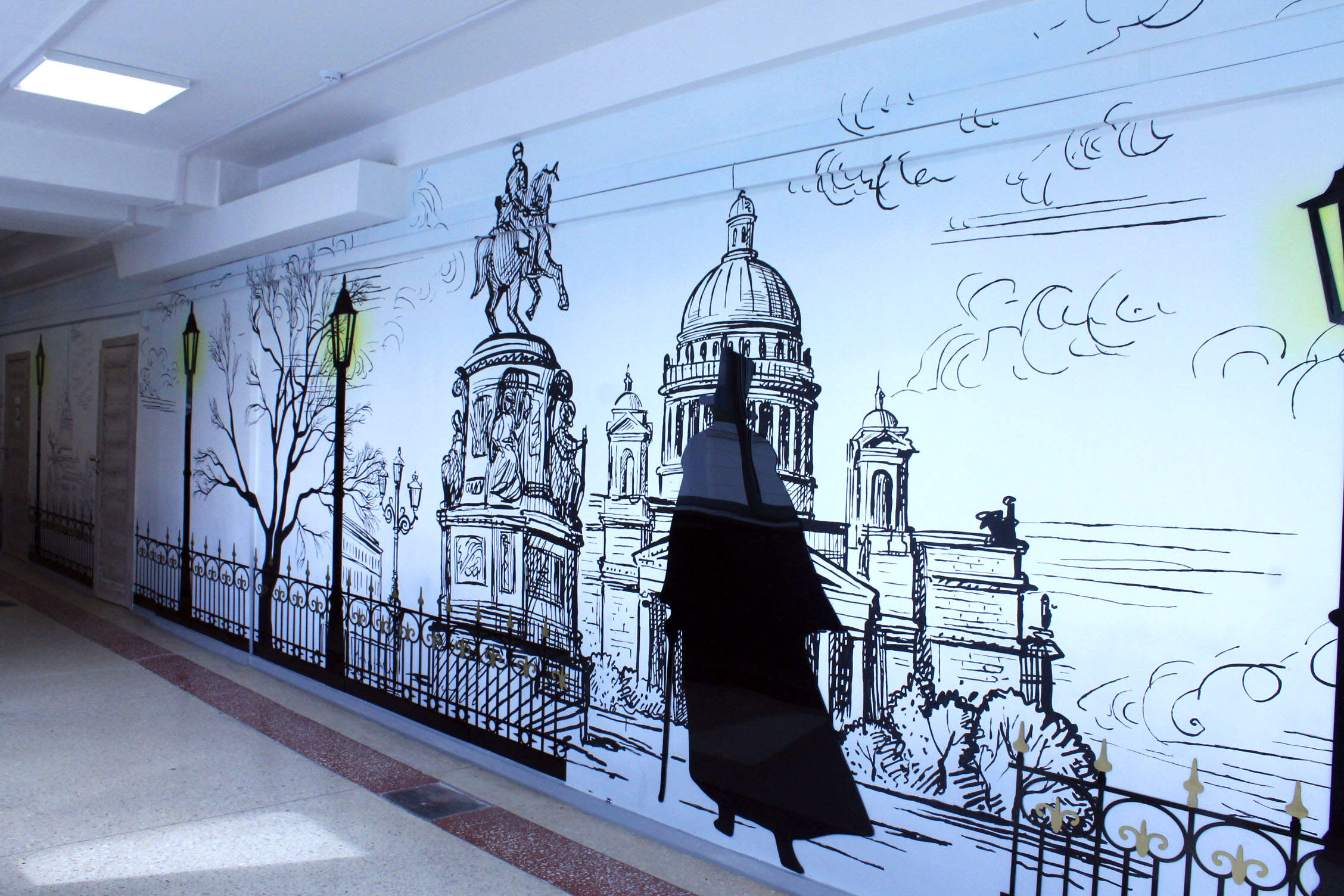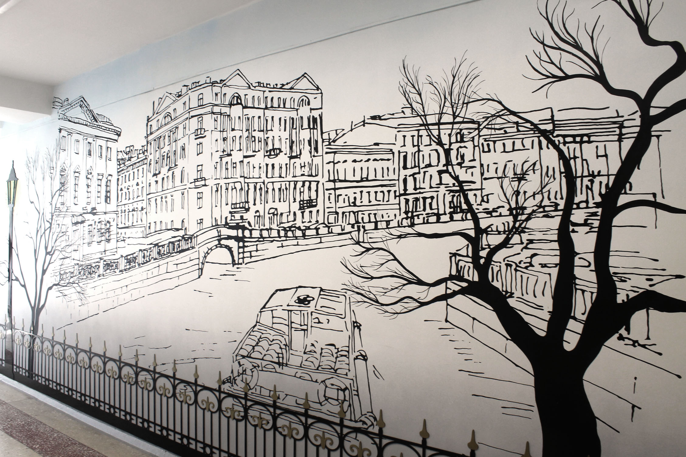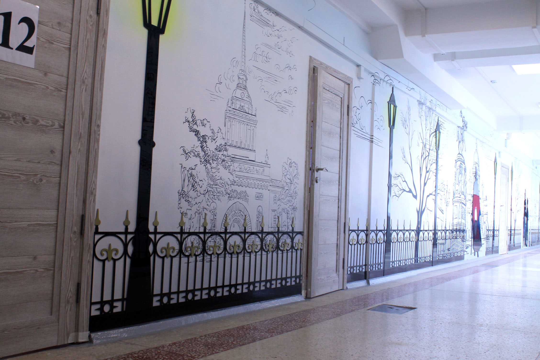Градиент на стенах и зарисовки Санкт-Петербурга дополнены элементами из черного акрила.