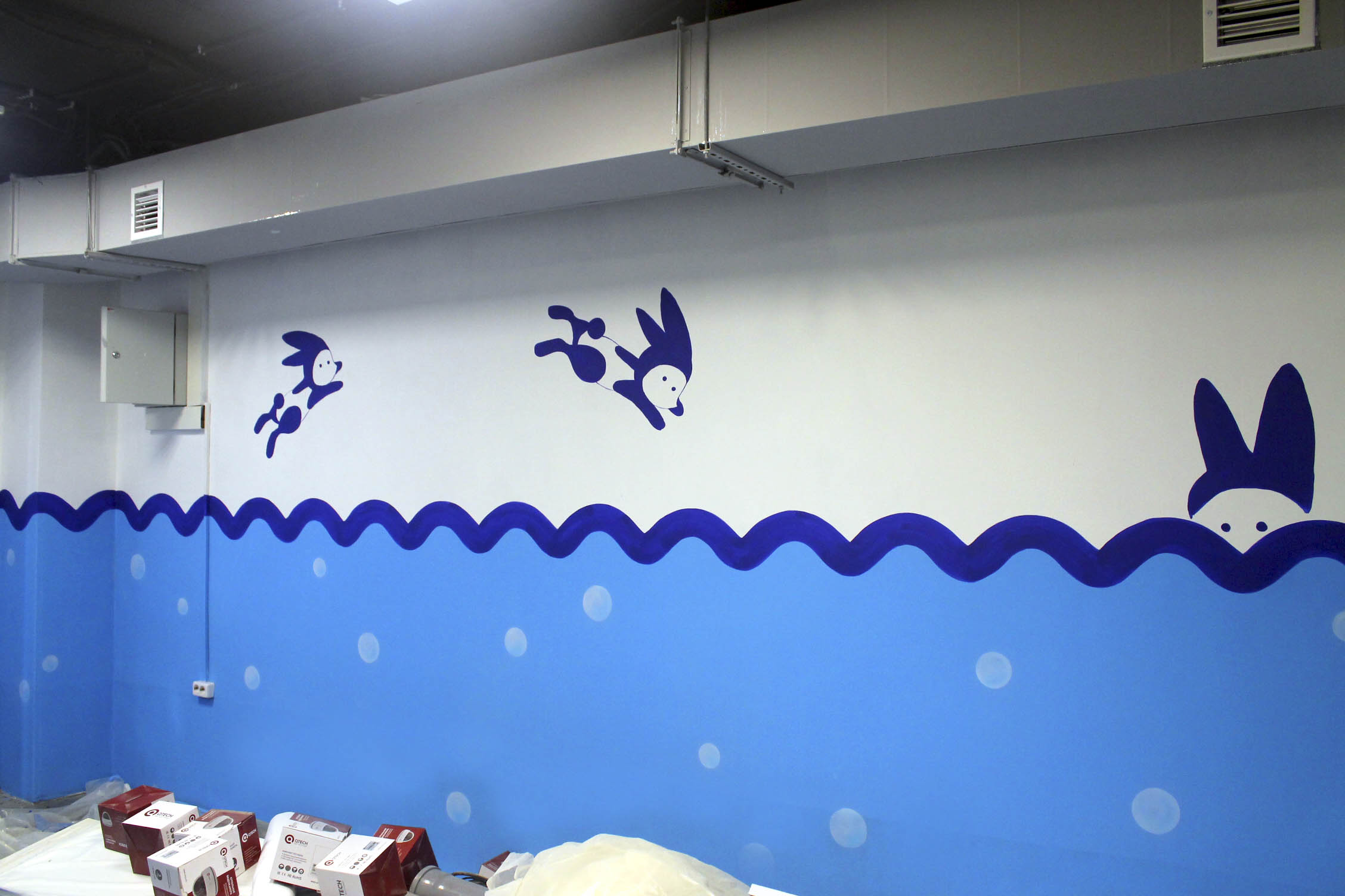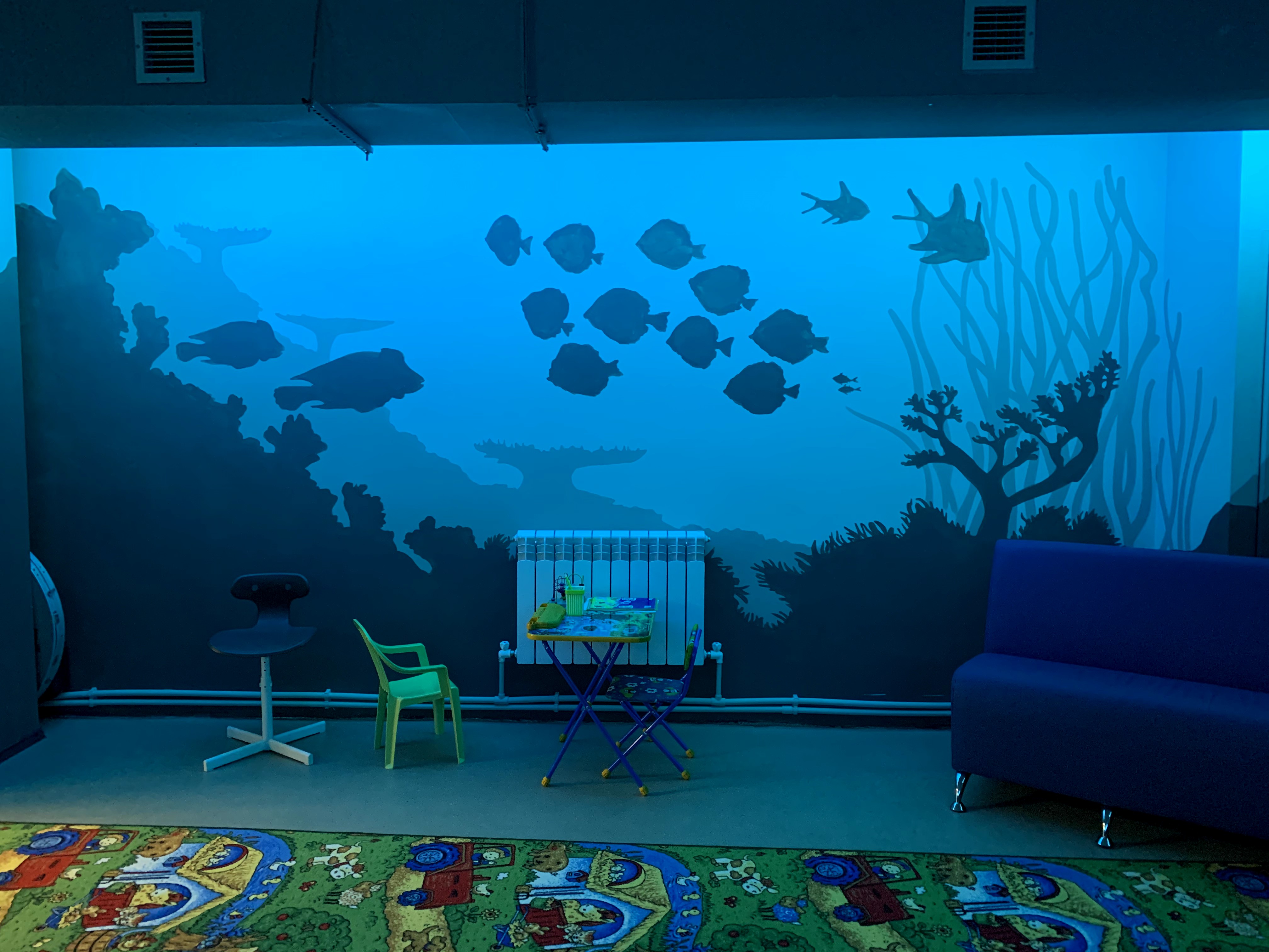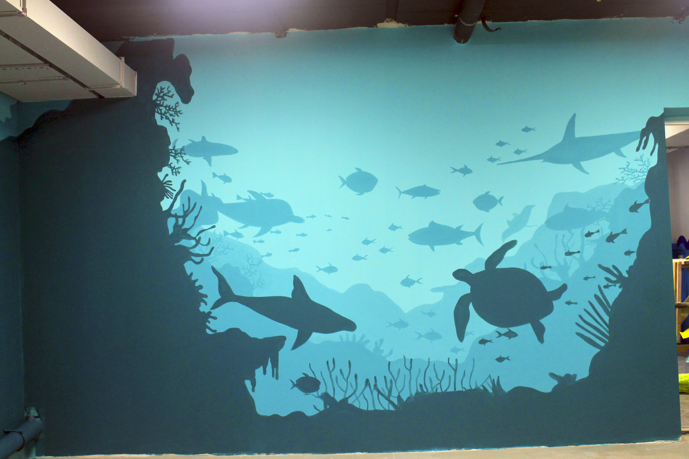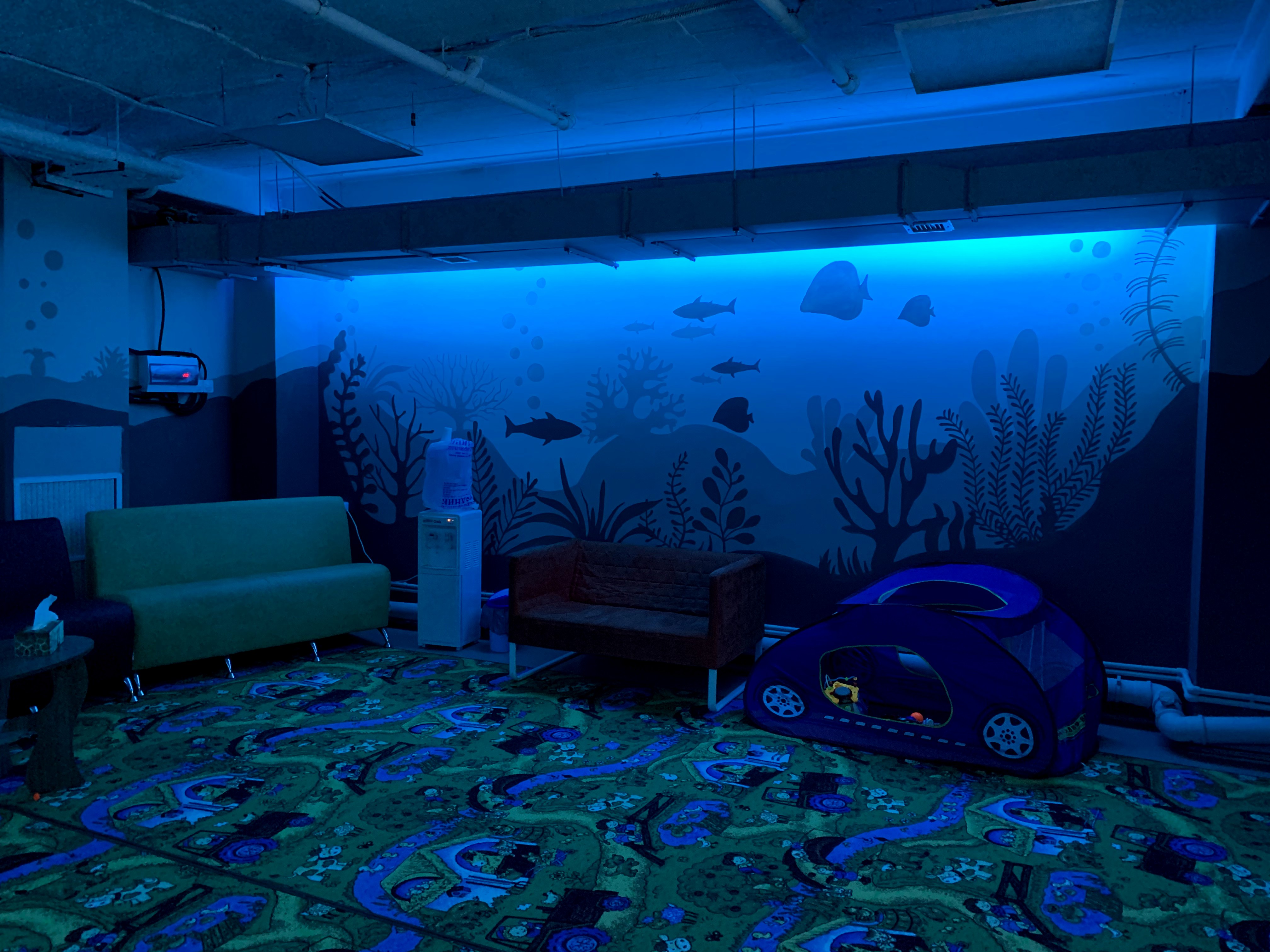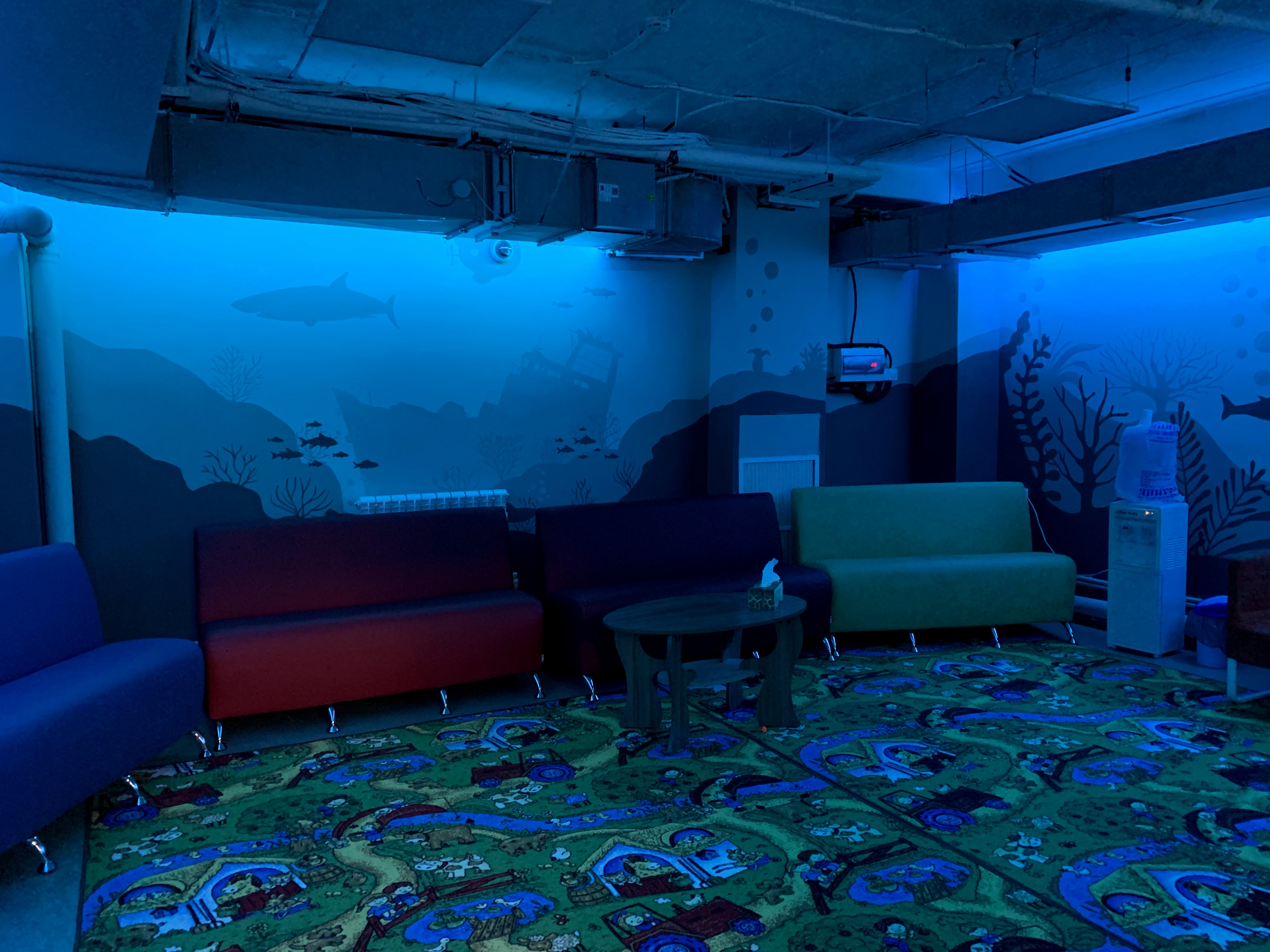 Так и в этом случаи @swimming_krol_yuzh_sakh решили подойти творчески. За неделю мы помогли оформить цокольный этаж помещения где будут заниматься дети, из серых тонов мы сделали его более светлым, а родителей в комнате ожидания своих малышей мы погружаем в подводный мир.