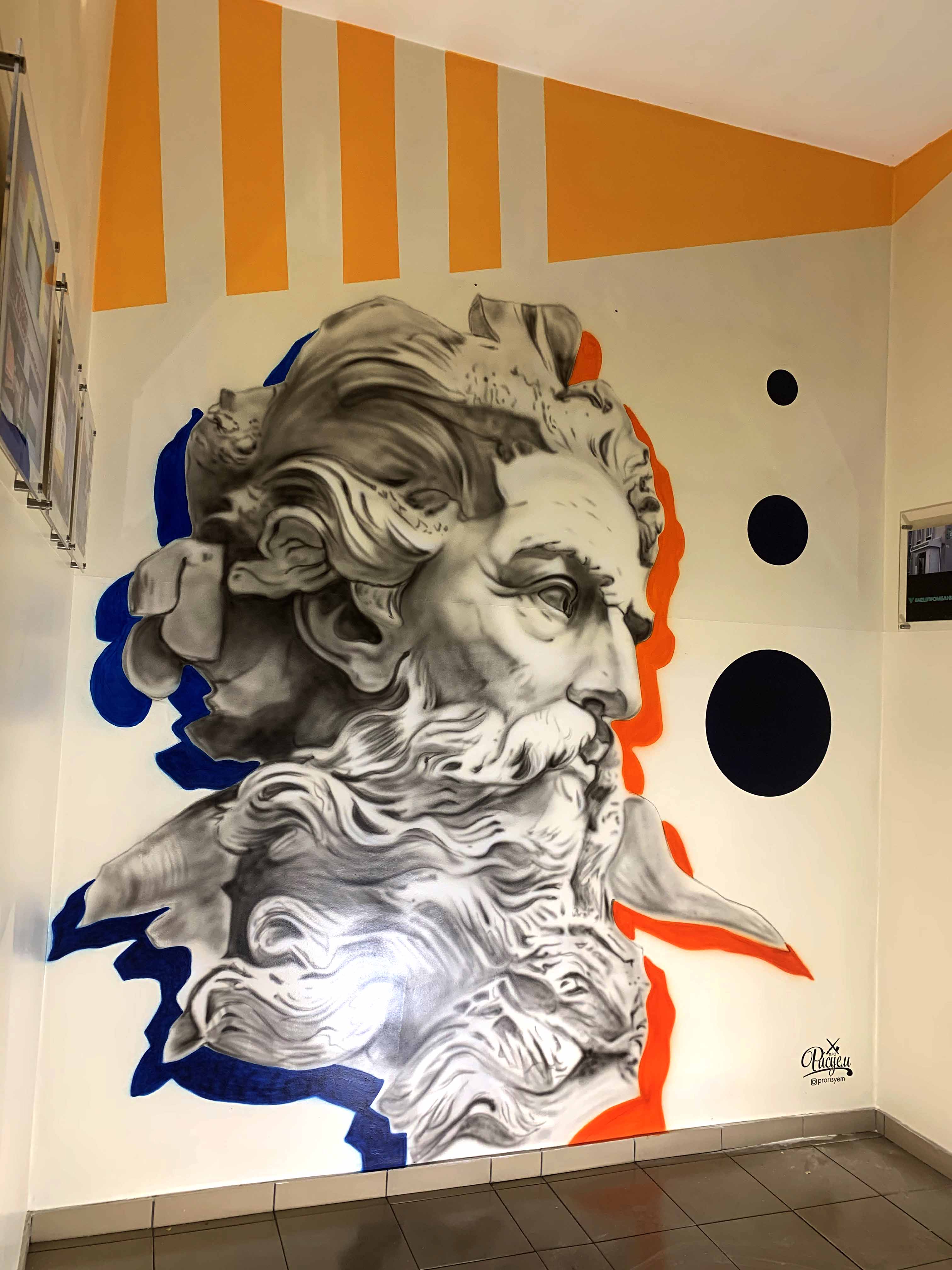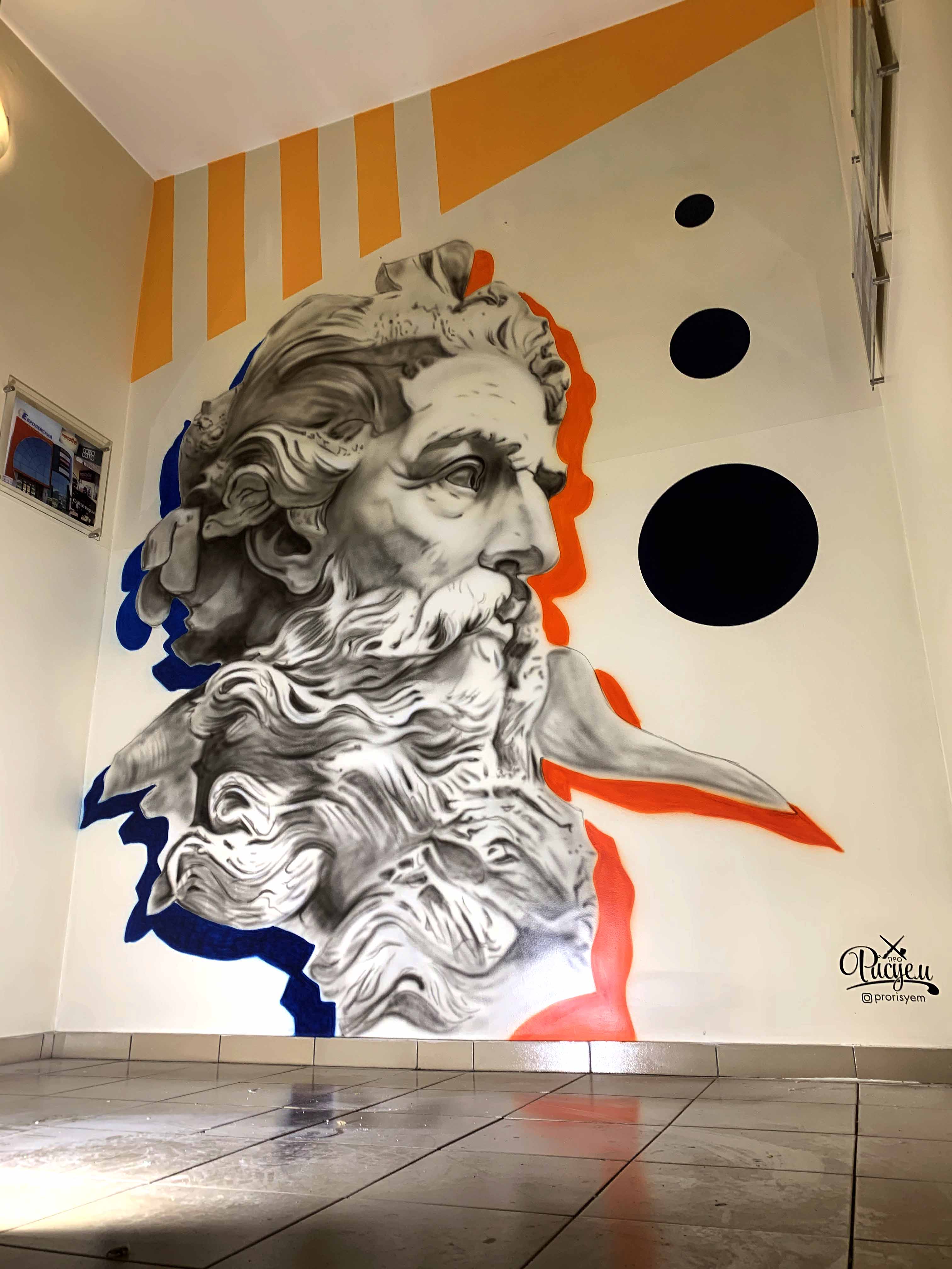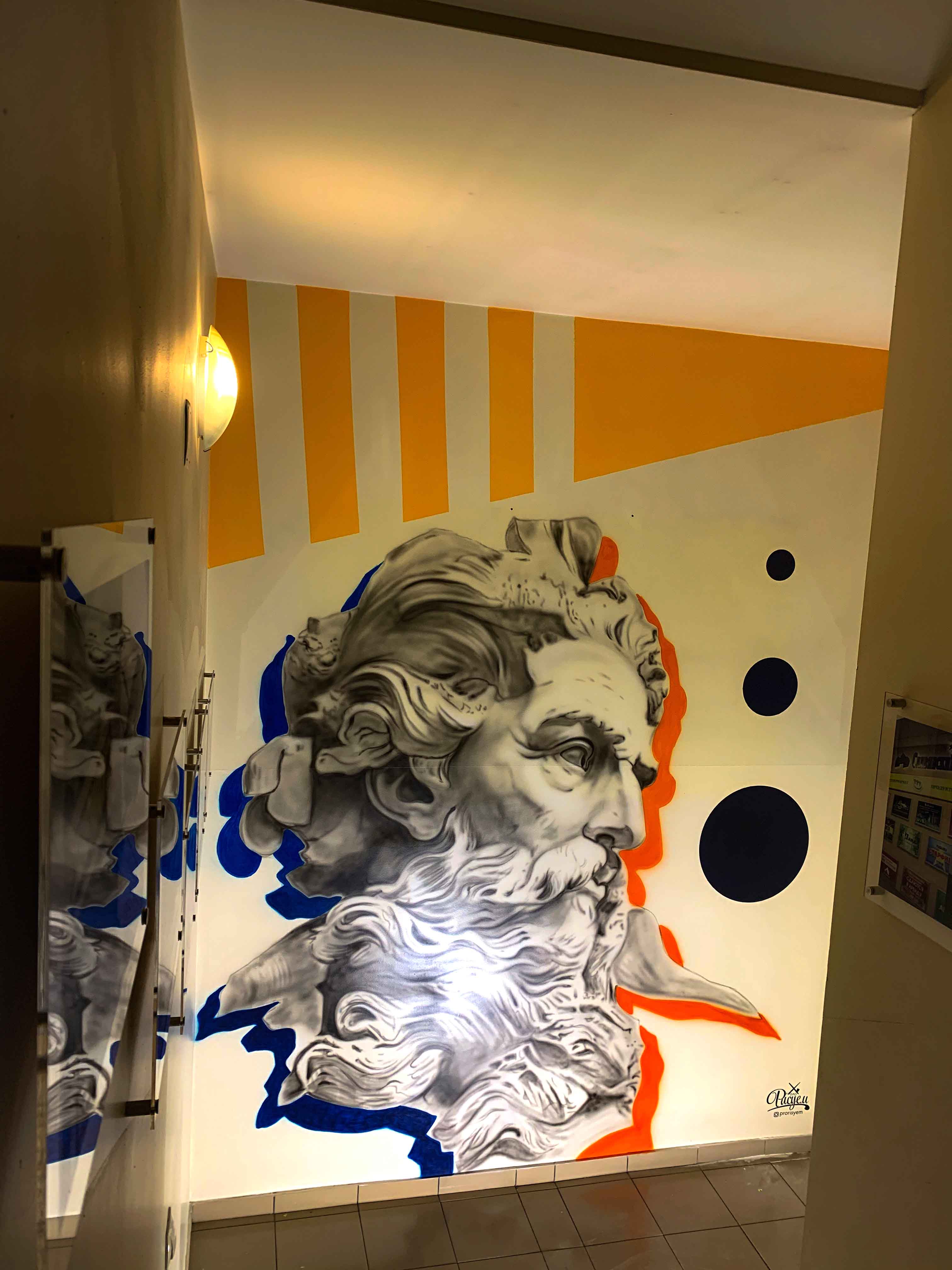сочетает в себе античность которая прославились великолепными скульптурами, и современный стиль супрематизм, разновидность геометрической абстракции.