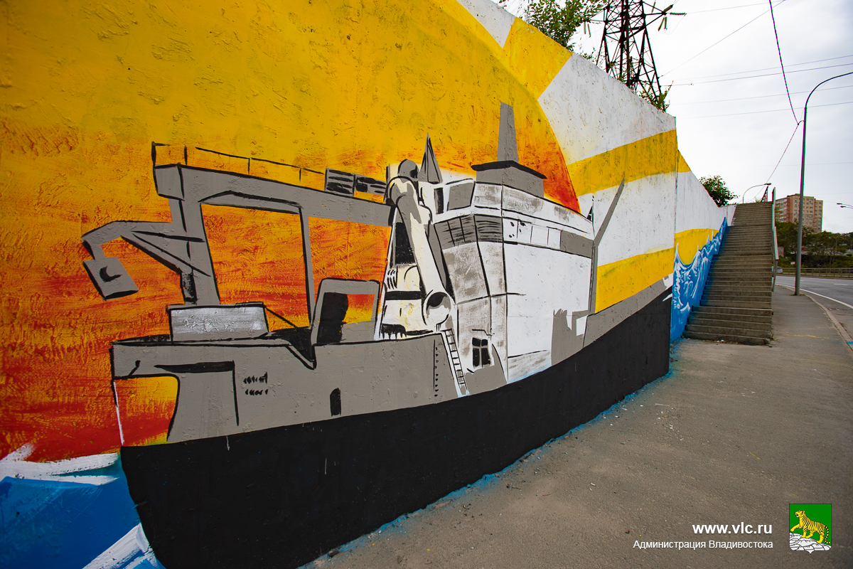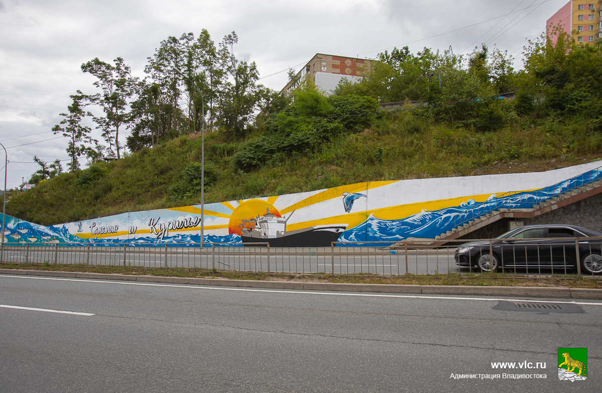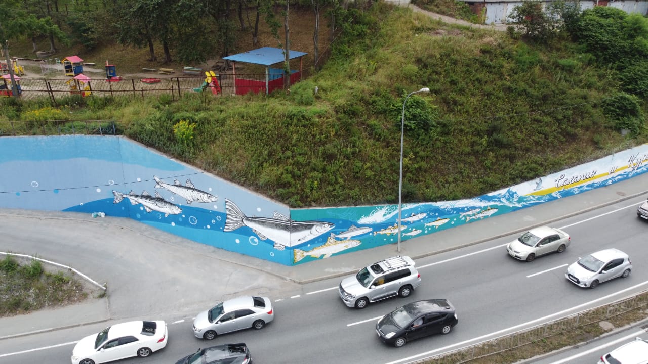 По нашим эскизу в Владивостоке появилось Первое художественное панно в рамках масштабного проекта «Мы – Дальний Восток». Мурал «Сахалин и Курилы» украсил улицу Героев-Тихоокеанцев.