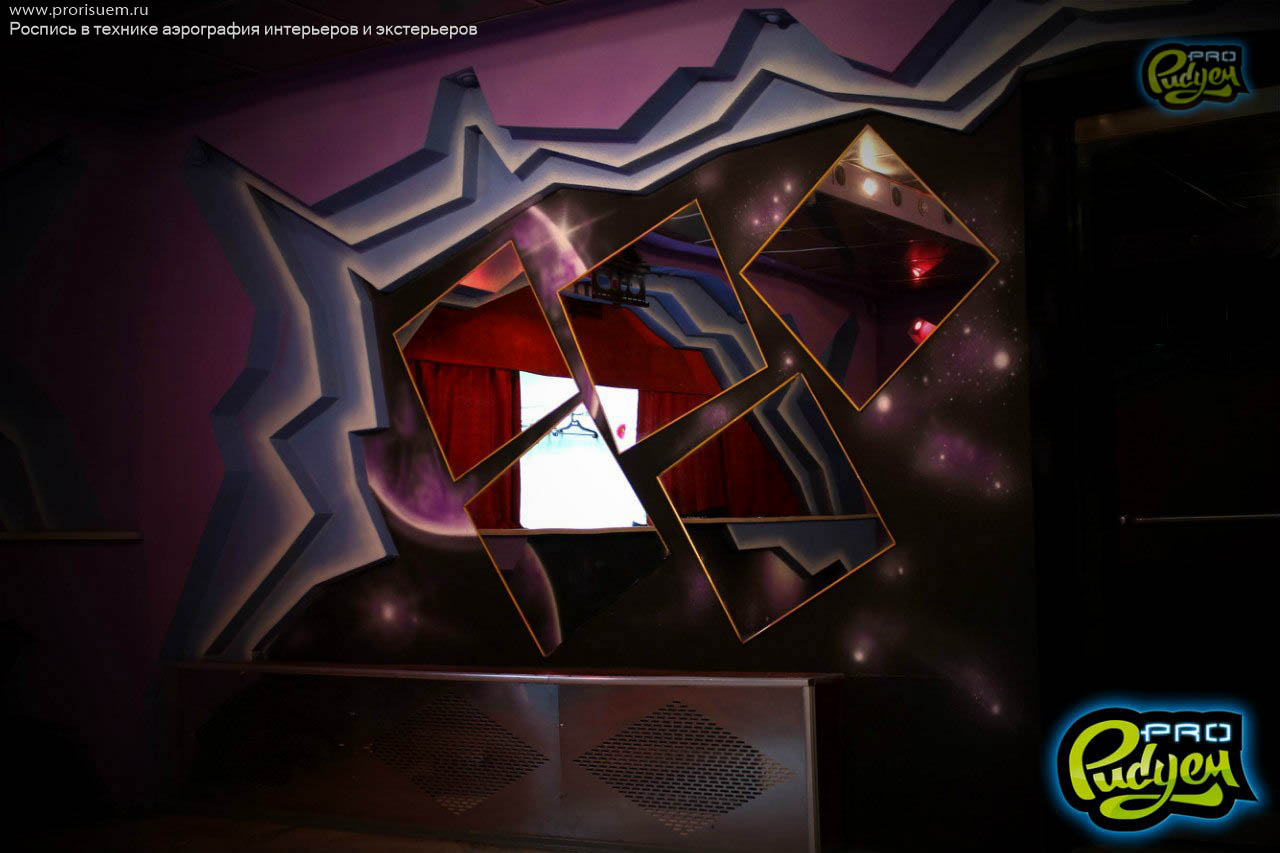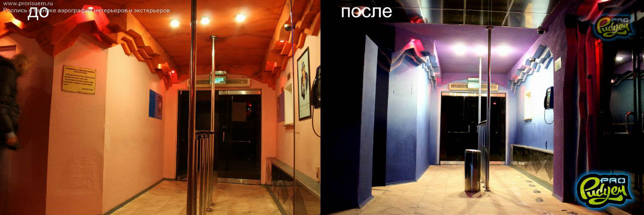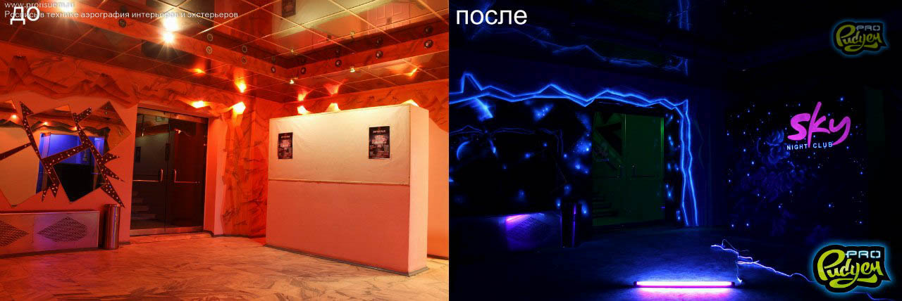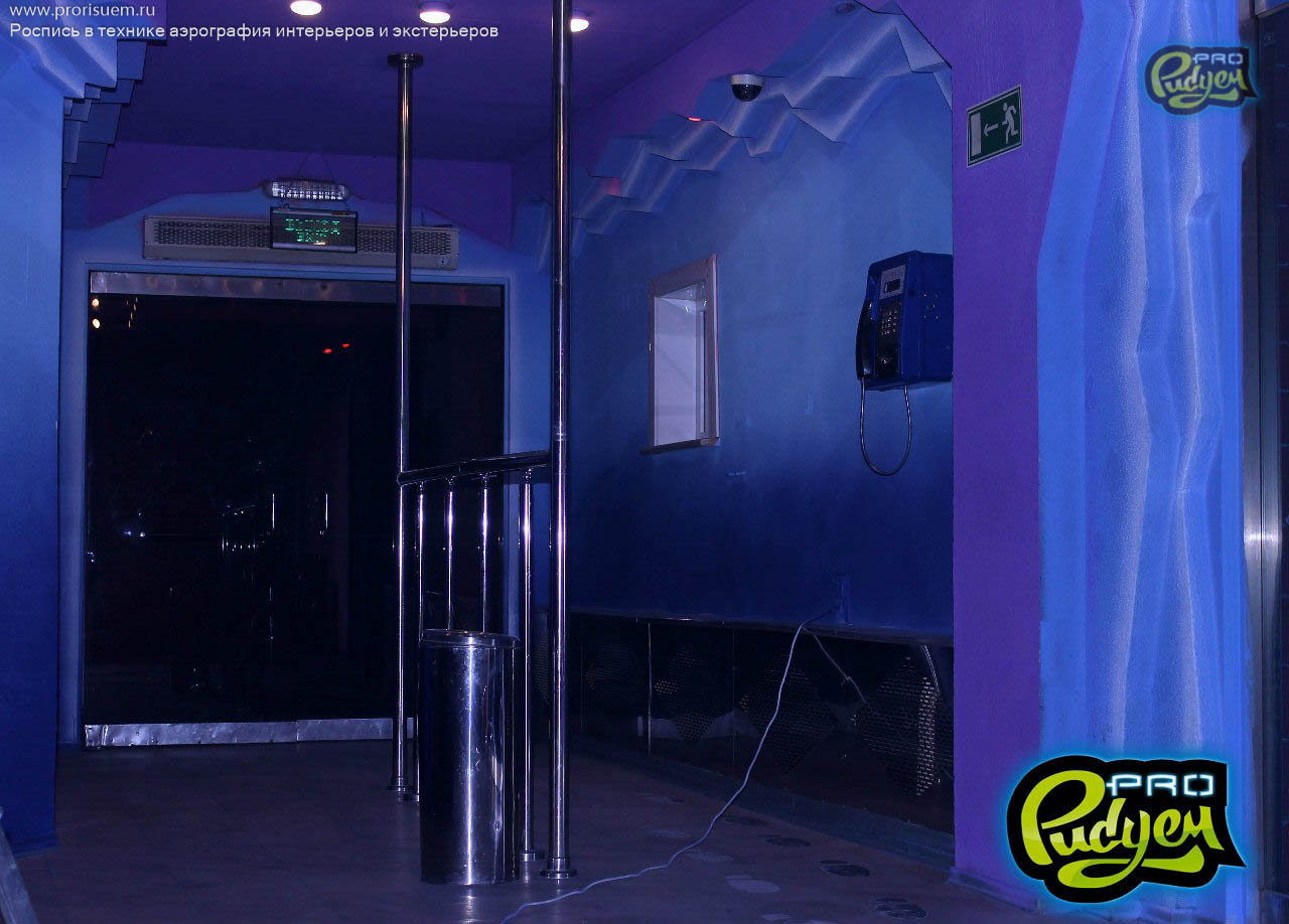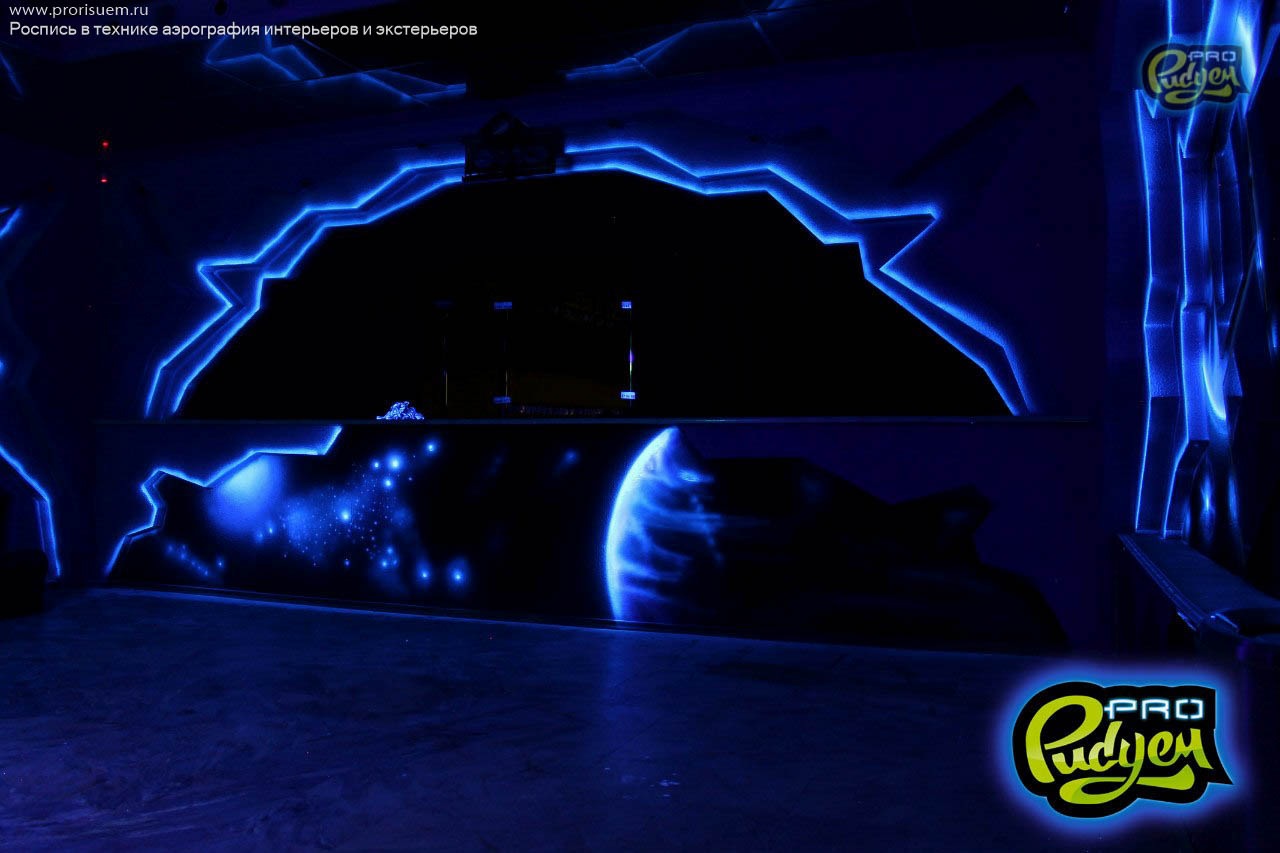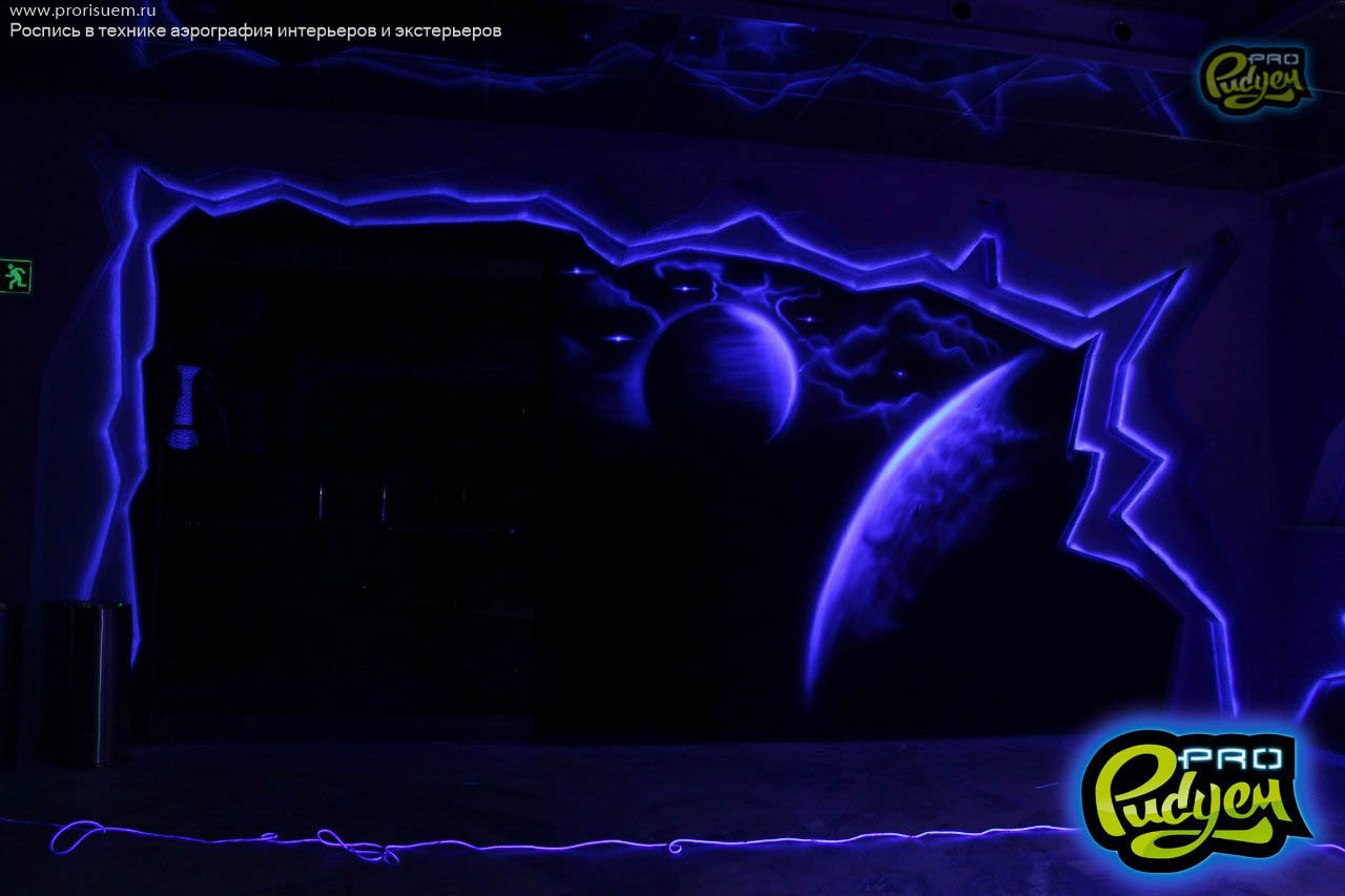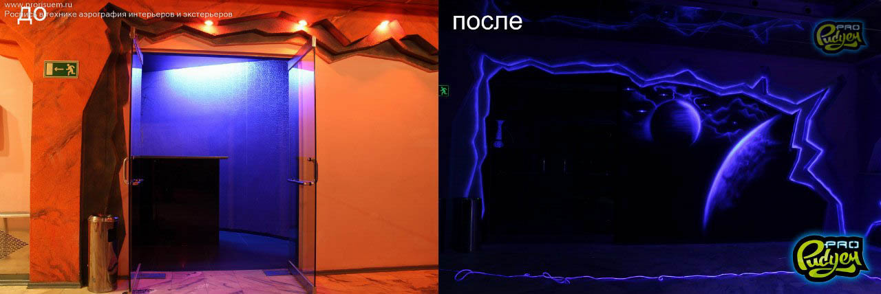 Представляем Вам оформление фойе в ночном клубе Южно-Сахалинска флуоресцентной краской.