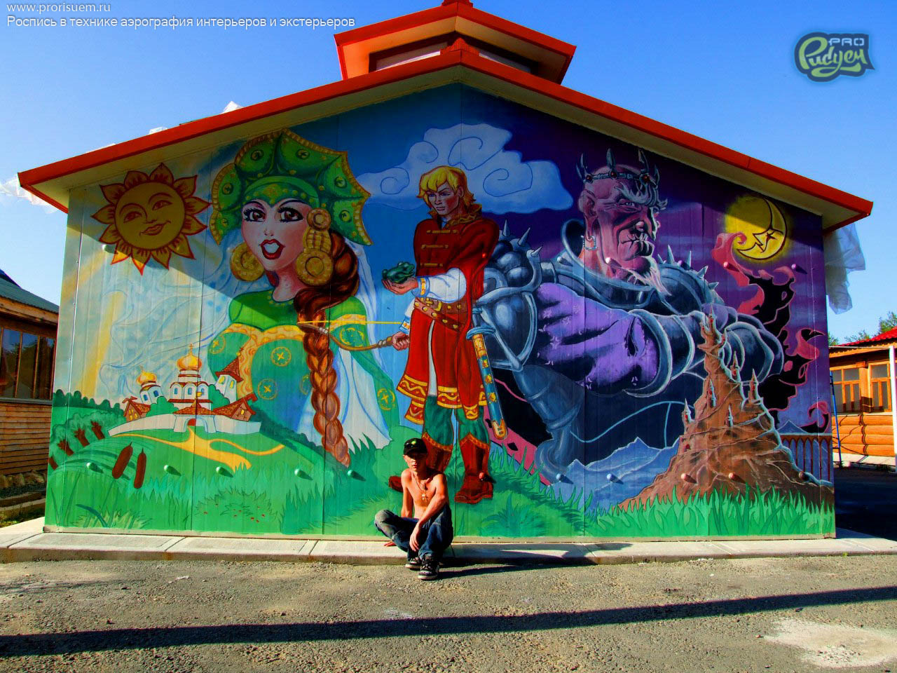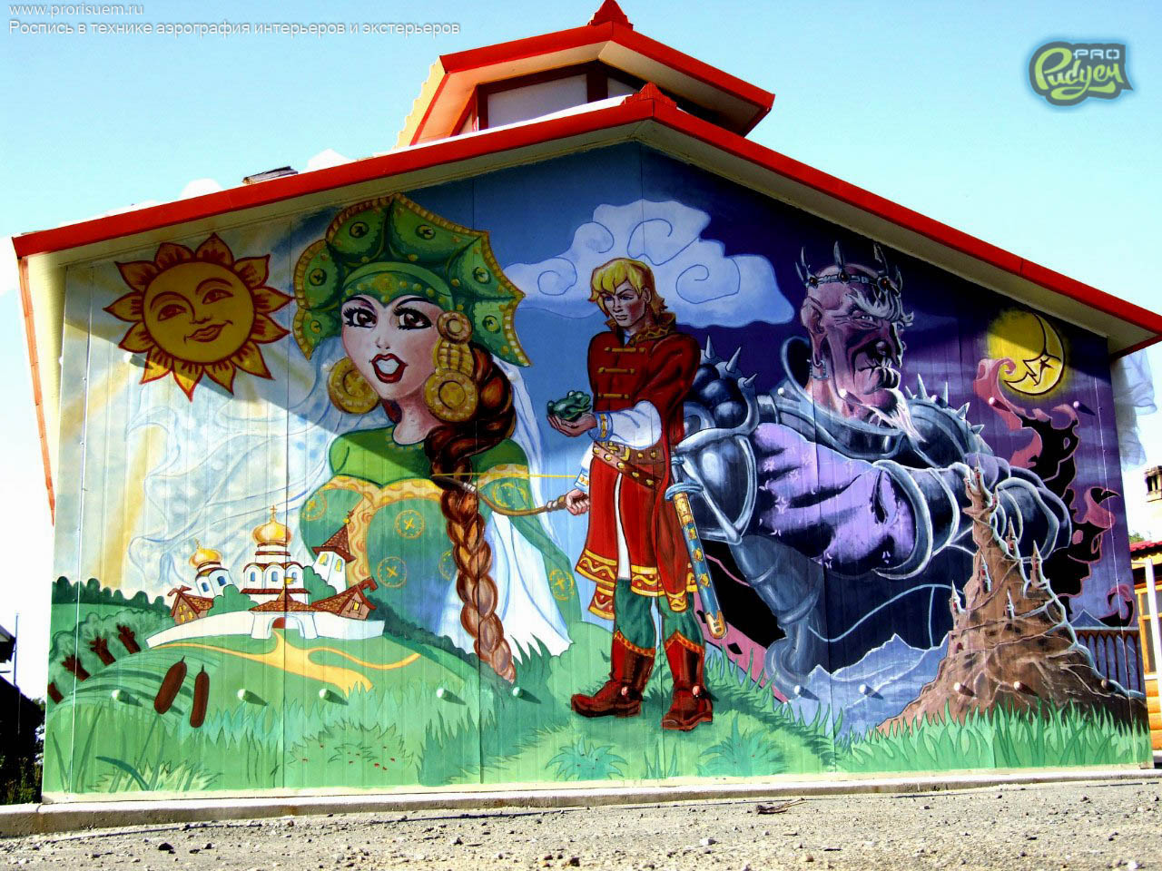 Представляем очередное наше творение, которое мы выполнили под заказ. Заказчик хотел чего-то яркого и необычного. И вместе мы создали, с нашей точки зрения, шедевр, что теперь радует глаз не только владельцу, но и гостям, да и просто зевакам. И вот перед Вами оформление фасада частного дома, расписанное, как всегда, в технике «Аэрография». И теперь и Вы можете побывать в гостях у сказки.