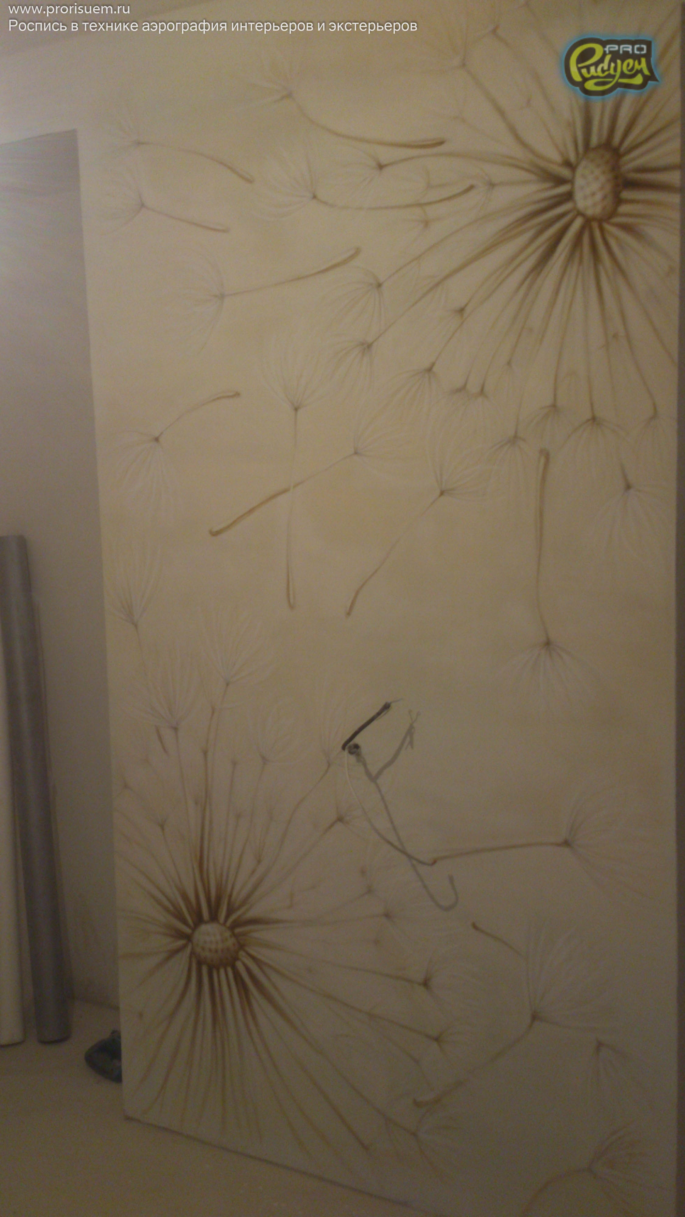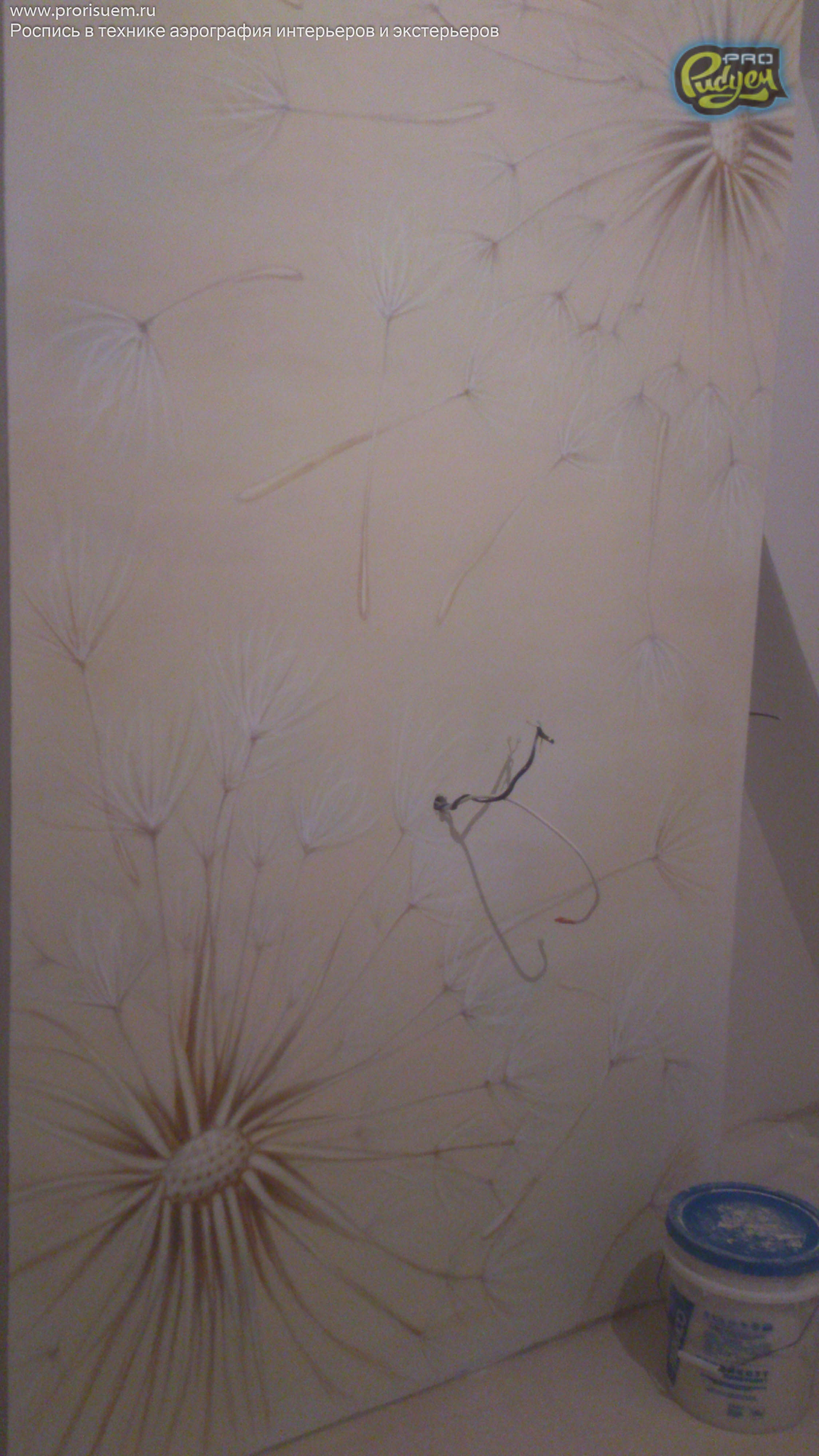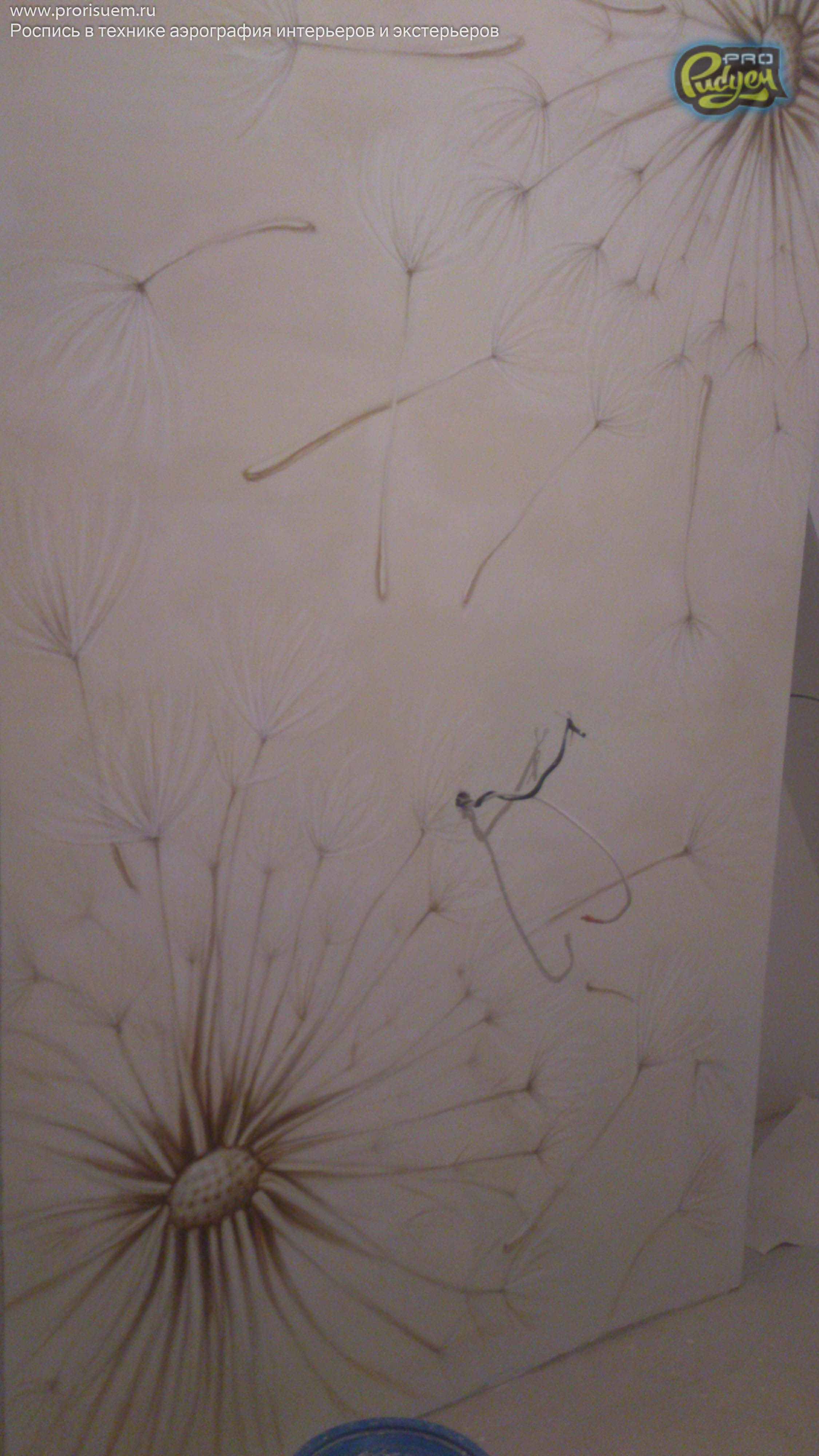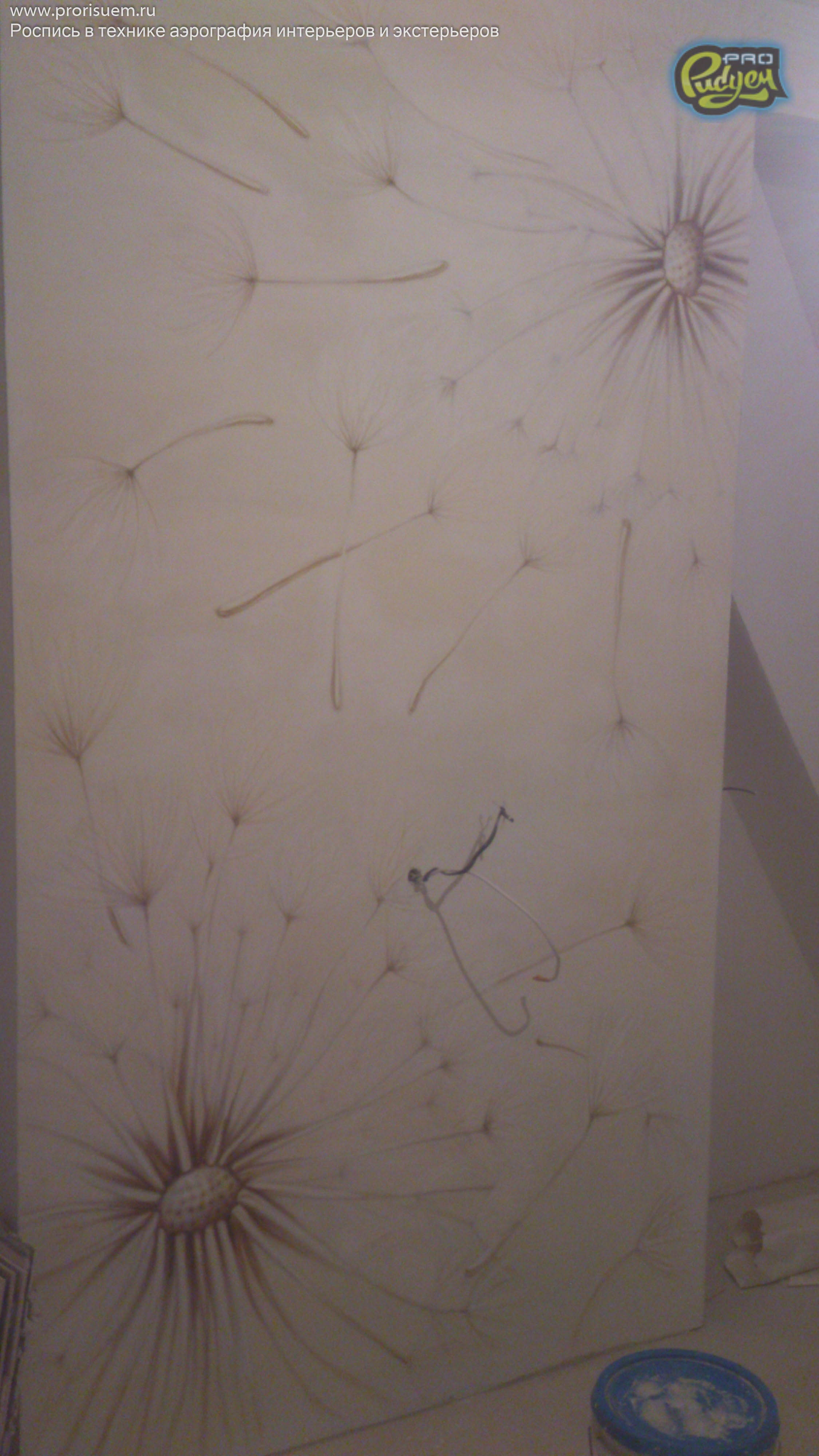 Очередная работа нашего коллектива Pro-Рисуем, «Одуванчики». Аэрография — это не только распрыскать краску из баллончика по поверхности, она любит творческий подход. А наша фантазия + опыт в подобных проектах дало нам возможность проявить себя в очередной раз. Перед Вами роспись стен в интерьере квартиры. Посмотрите, вроде как, не плохо получилось?