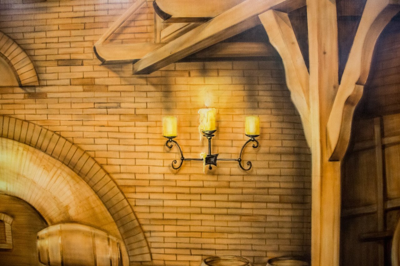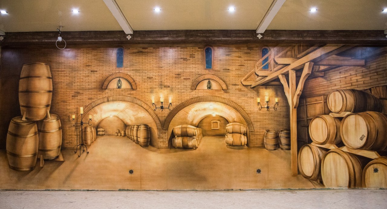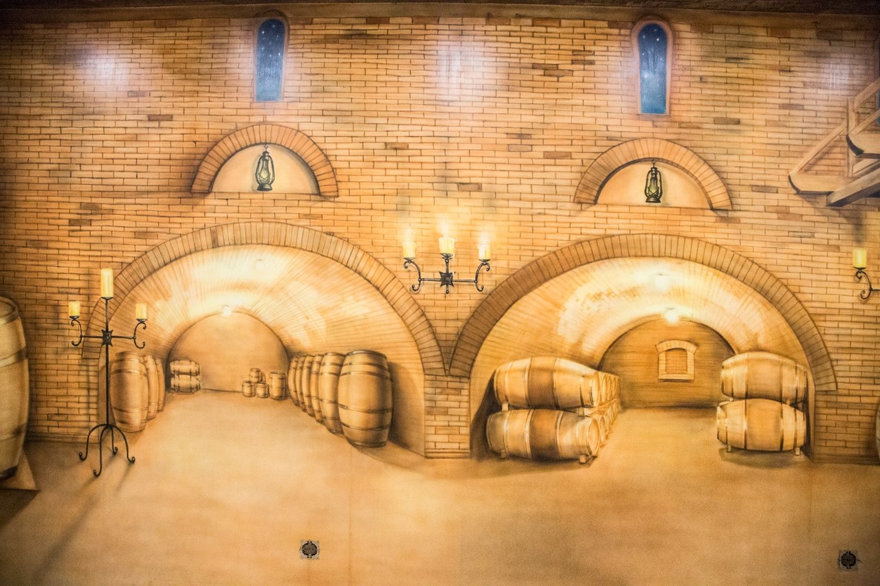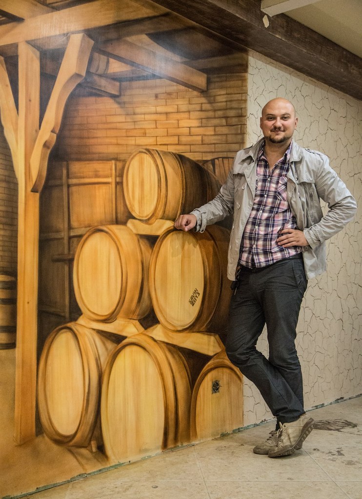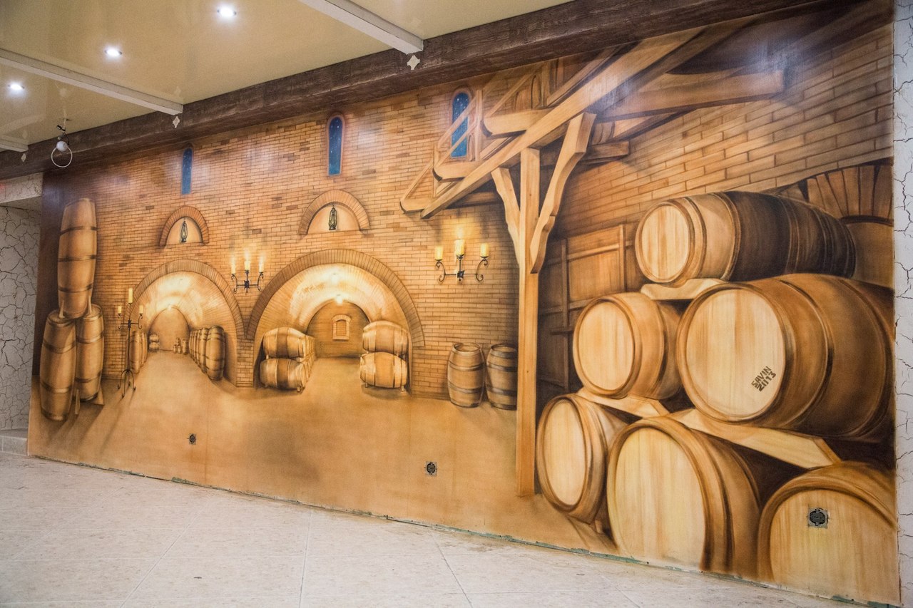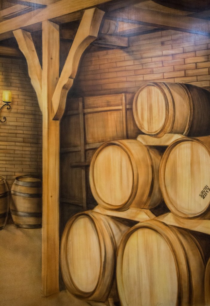Рисунок, если вглядеться, имеет 3D проекцию, что создает впечатление прибывания в винном погребе. Работа выполнена, как и все аэрографом.