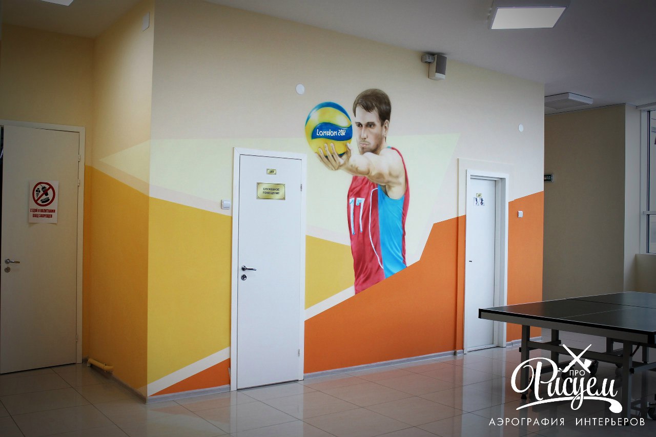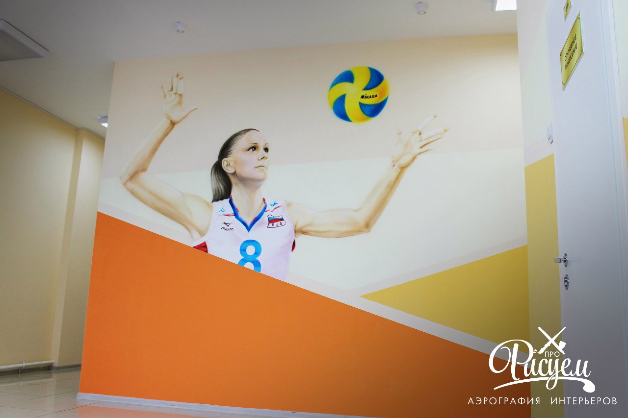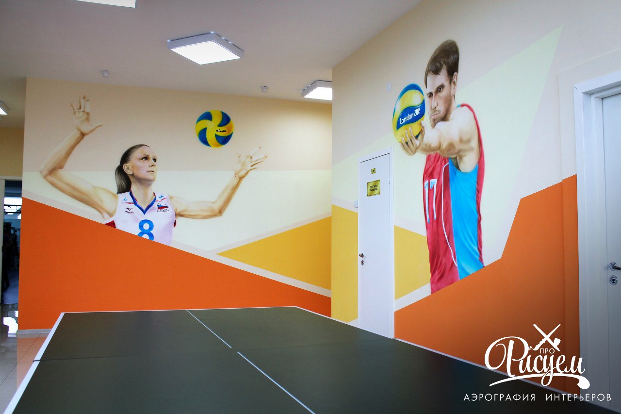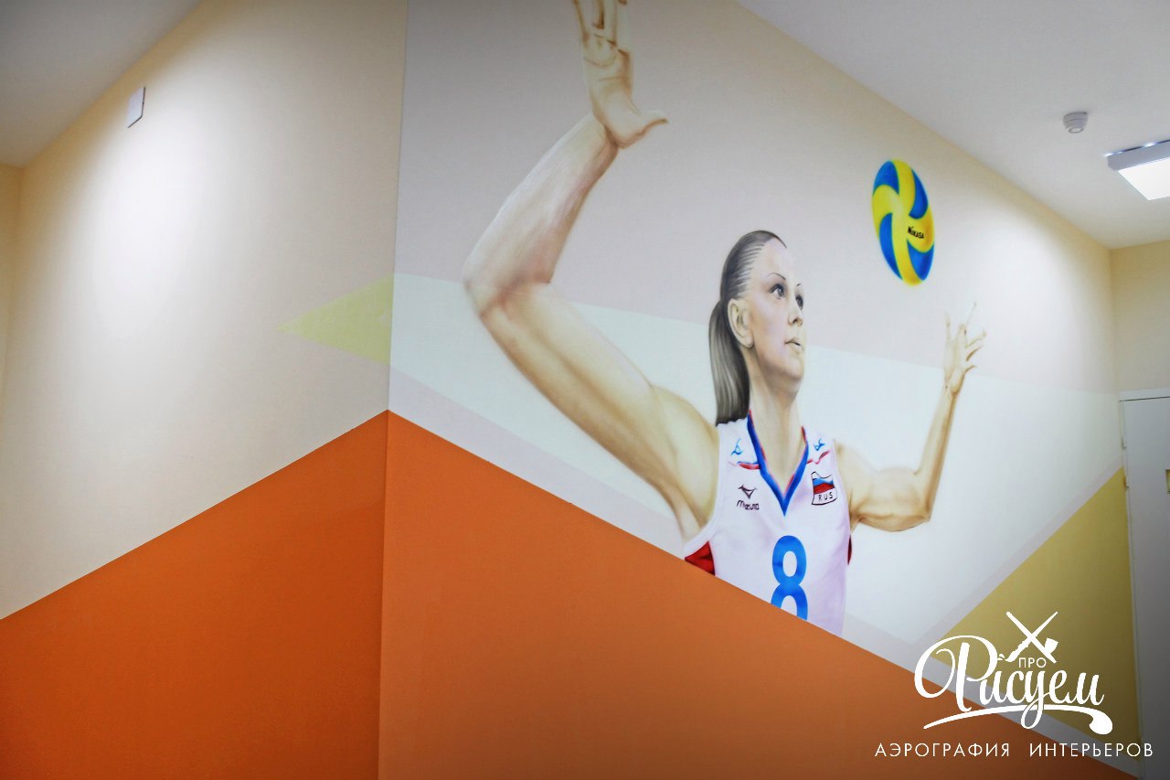 Роспись в Волейбольном центре действительно получилась спортивной, в короткие сроки мы оформили стены интерьера, линиями мы задали динамику интерьеру, два спортсмена подчеркивают принадлежность волейбольного центра.