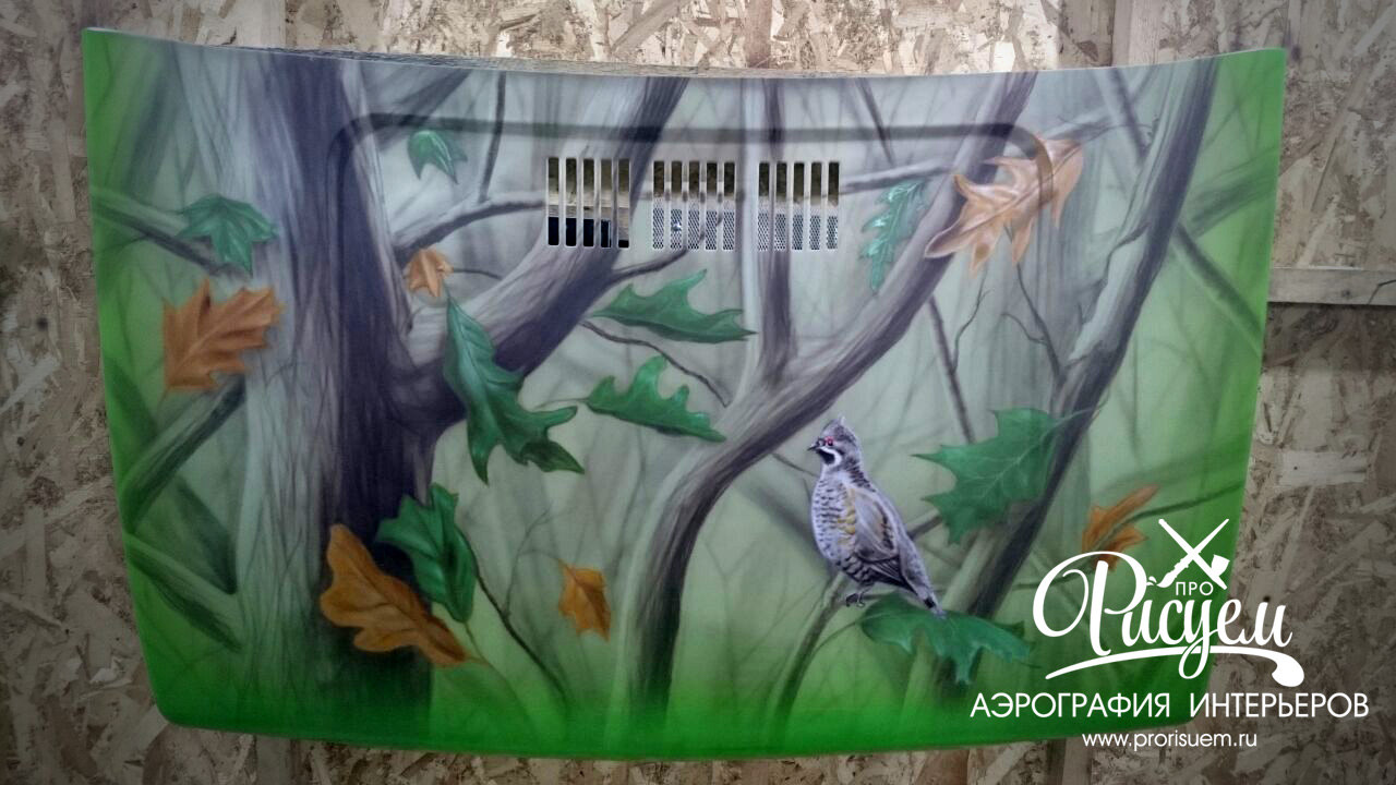 Аэрография на капоте от Нивы. По краю оставлен родной цвет автомобиля, в центре расположен рисунок.
