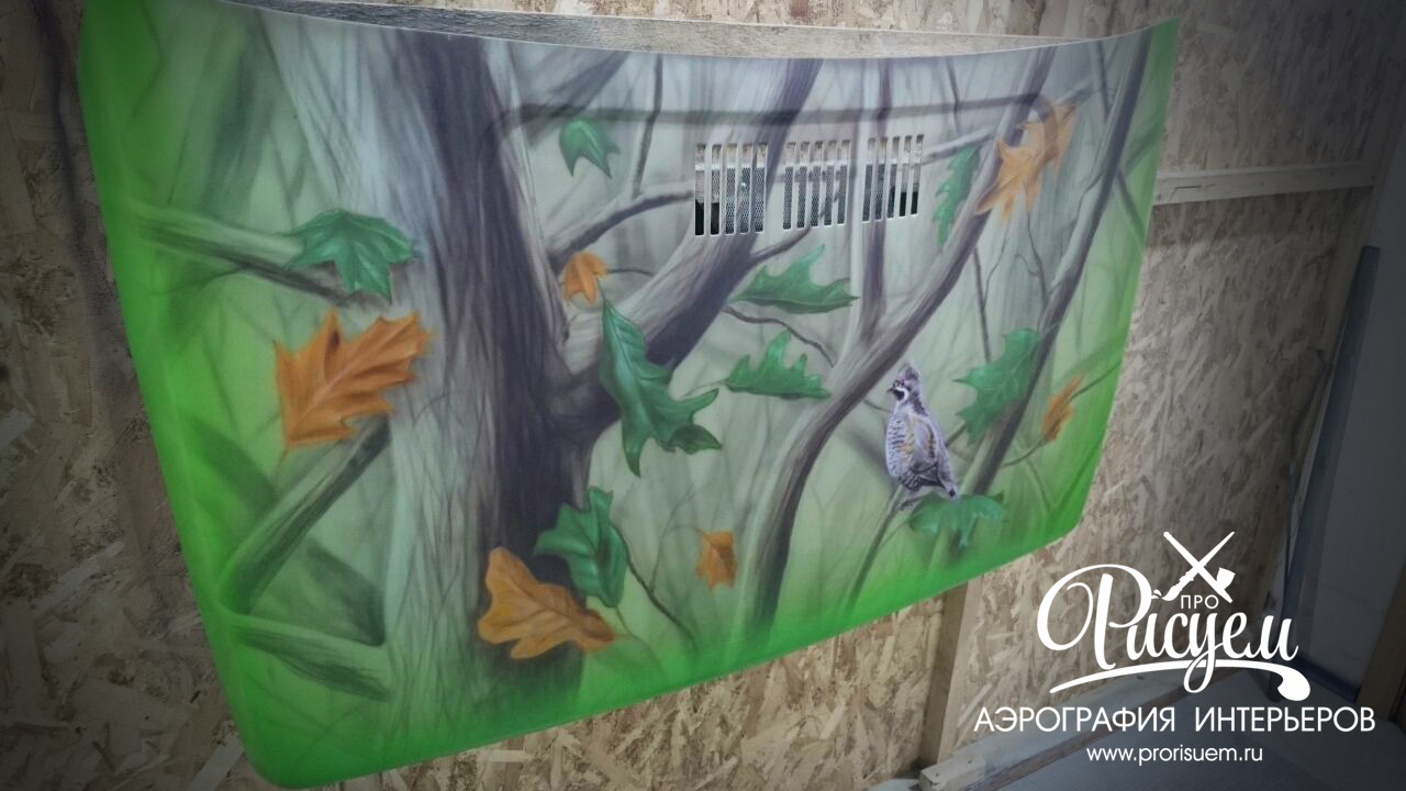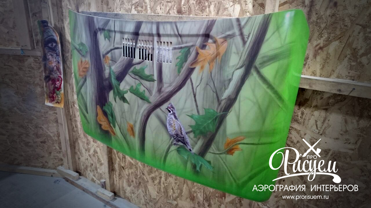 Данный автомобиль используется владельцем для поездок в лес по бездорожью с целью забраться подальше, чтобы поохотиться, или порыбачить. Именно это и послужило мотивом для изображения. Это камуфляжная окраска в стиле "осенний лес". Заказчик хотел немного оживить композицию и было решено добавить птицу, которая сидит на одной из веток. Данная работа проводилась в рамках акции компании автолог "аэрография за репост". Сама компания занимается кузовными работами и ремонтом авто, помещение и материалы были предоставлены руководством компании. Лакировка и полировка производилась профессиональными сотрудниками автолога, а подготовка и аэрография дело рук ProРисуем.