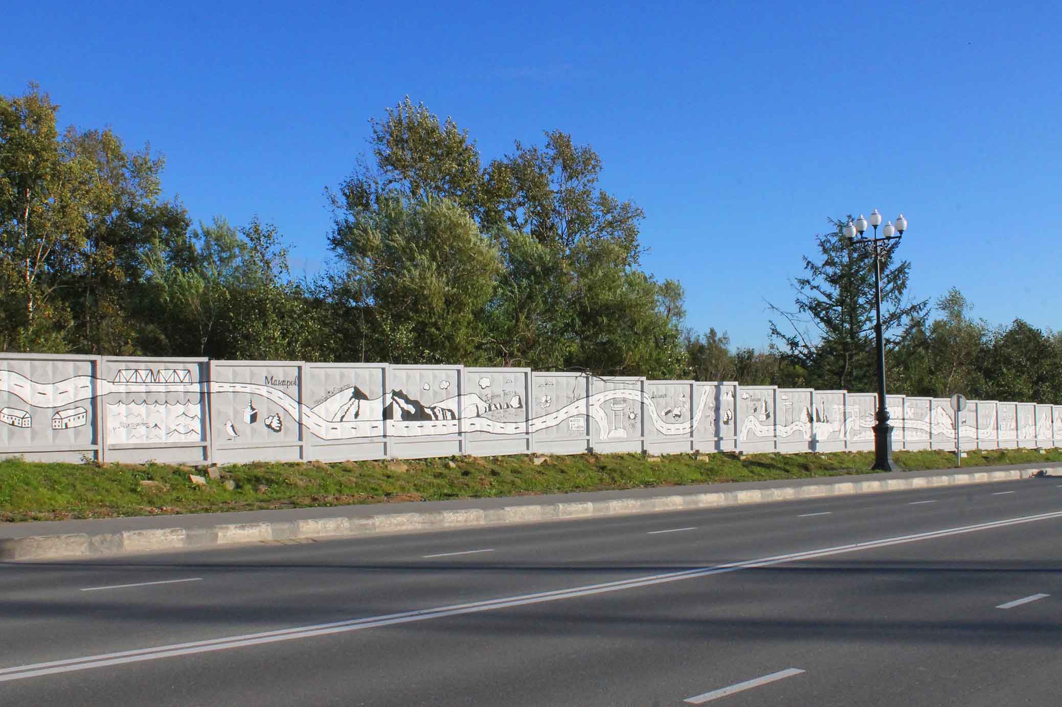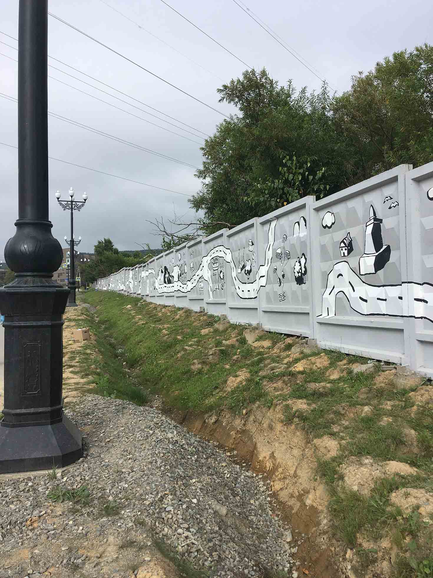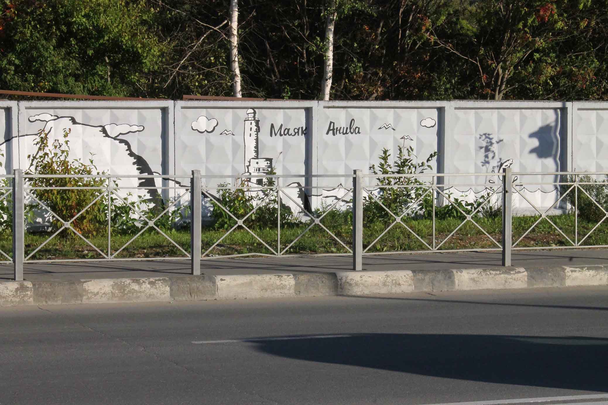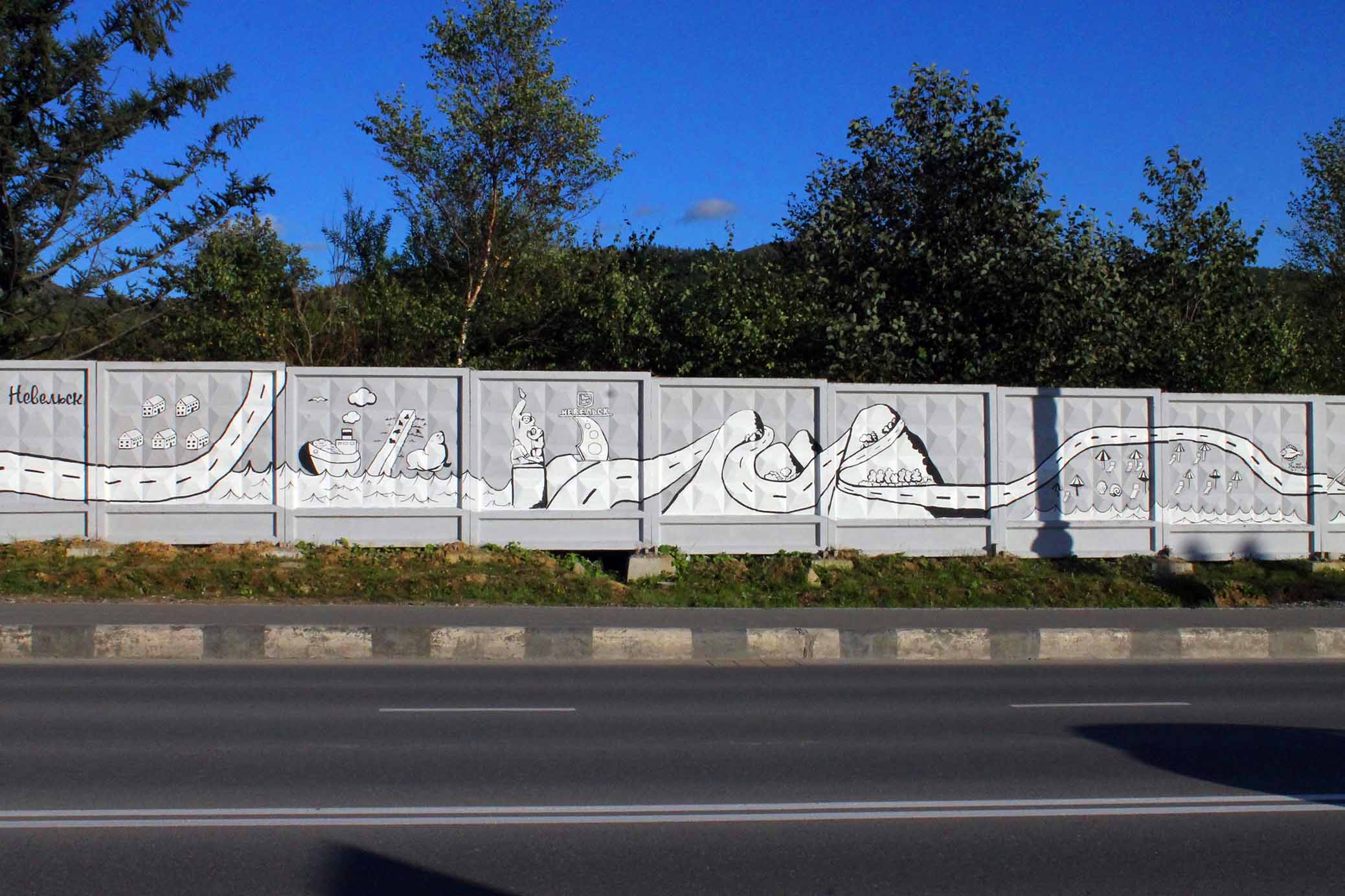 Серый забор на улице Горького под кистью стрит-арт-творцов превращается в маршрут от самой северной точки острова до южной оконечности Сахалина. На каждой из 110 секций местные достопримечательности - маяки, порты, тории.